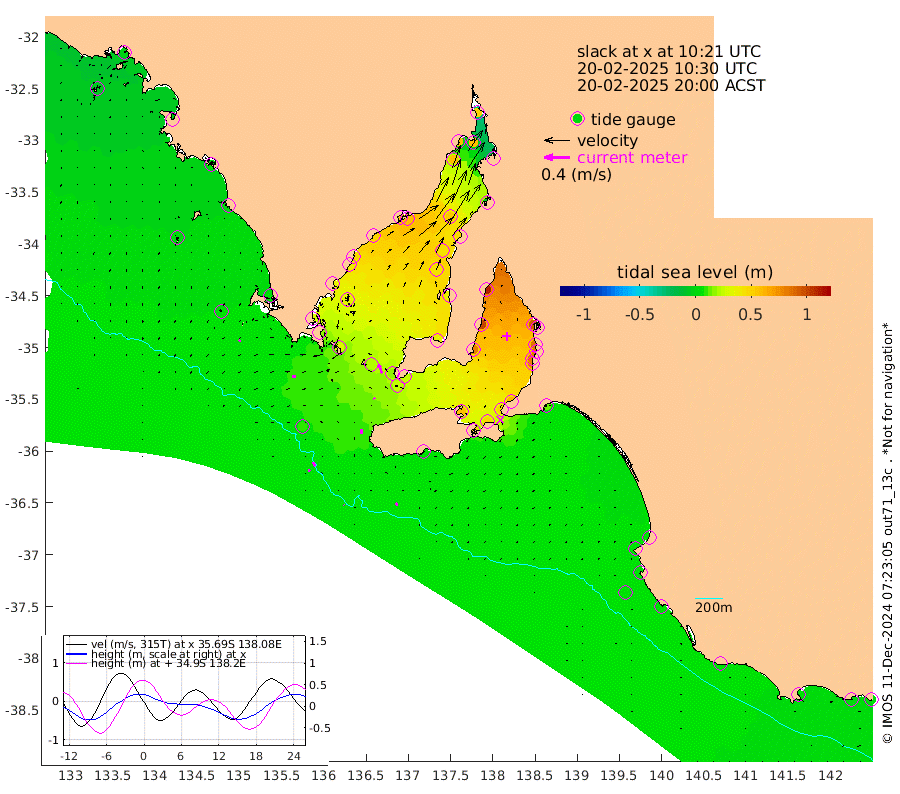 1cm/s 137T +10cm/s rms + 5cm/s 114T. SAM1DS 520m 6cm/s -98T +13cm/s rms + 5cm/s -36T. SAM2CP 100m 7cm/s -38T +21cm/s rms + 18cm/s 142T. SAM3MS 168m 5cm/s -22T +22cm/s rms + 0cm/s -30T. SAM4CY 117m 3cm/s -135T +23cm/s rms + 2cm/s 99T. SAM5CB 94m 2cm/s -34T +8cm/s rms + 3cm/s -172T. SAM6IS 83m 3cm/s -28T +11cm/s rms + 7cm/s 150T. SAM7DS 519m 14cm/s -22T +10cm/s rms + 2cm/s 87T. SAM8SG 47m 7cm/s 1T +20cm/s rms + 12cm/s -168T. NRSKAI 101m 3cm Warrnambool 3cm Port Fairy 5cm Portland 5cm Port Macdonnell 7cm Beachport 6cm Cape Rabelais (off) 6cm Robe 5cm Cape Jaffa 5cm Kingston 12cm Victor Harbor 6cm Vivonne Bay 56cm Kingscote 52cm American River 45cm Penneshaw 48cm Cape Jervis 63cm Second Valley 78cm Port Noarlunga 82cm Port Stanvac 84cm Brighton 85cm Glenelg 93cm Port Adelaide (Outer Harbor) 91cm Angus Inlet (Garden Island) 110cm Ardrossan 100cm Port Vincent 81cm Port Giles 23cm Stenhouse Bay 24cm Althorpe Island 18cm Pondalowie Bay 35cm Point Turton 35cm Port Victoria 43cm Cape Elizabeth 45cm Tiparra Reef Light 47cm Wallaroo 56cm Middle Bank -1cm Port Broughton 42cm Port Pirie 50cm Red Cliff Point (Beacon 5) 57cm Port Bonython 59cm Whyalla 56cm Western Shoal Beacon 55cm Franklin Harbor 57cm Franklin Harbor Entrance Beacon 49cm Arno Bay 49cm Port Neill 40cm Cape Hardy 35cm Tumby Bay 35cm Reevesby Island 27cm Port Lincoln 19cm Taylors Landing 30cm Whalers Bay 21cm Wedge Island Mooring 10cm Shelf Edge Mooring 7cm Coffin Bay Entrance Beacon 5cm Greenly Island 2cm Elliston 1cm Pearson Island 6cm Venus Bay -2cm Blanche Port (Streaky Bay) -3cm Thevenard -5cm St Francis Island