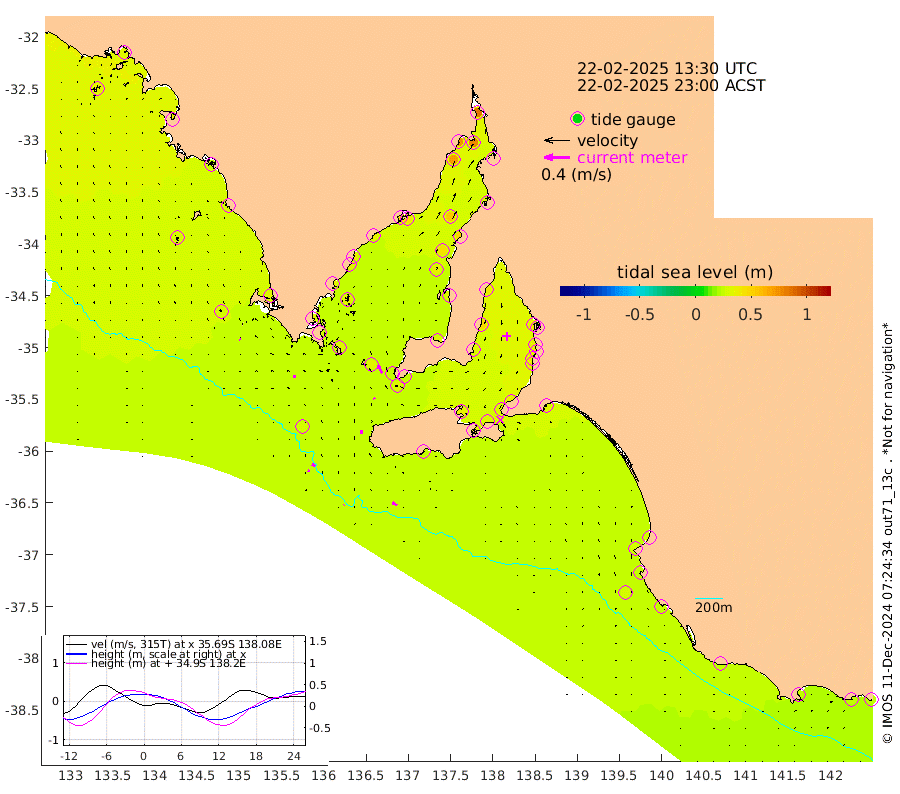 1cm/s -107T +10cm/s rms + 5cm/s 114T. SAM1DS 520m 4cm/s -94T +13cm/s rms + 5cm/s -36T. SAM2CP 100m 6cm/s -63T +21cm/s rms + 18cm/s 142T. SAM3MS 168m 9cm/s -53T +22cm/s rms + 0cm/s -30T. SAM4CY 117m 2cm/s -47T +23cm/s rms + 2cm/s 99T. SAM5CB 94m 2cm/s -22T +8cm/s rms + 3cm/s -172T. SAM6IS 83m 3cm/s -67T +11cm/s rms + 7cm/s 150T. SAM7DS 519m 14cm/s -27T +10cm/s rms + 2cm/s 87T. SAM8SG 47m 6cm/s -4T +20cm/s rms + 12cm/s -168T. NRSKAI 101m 23cm Warrnambool 24cm Port Fairy 25cm Portland 23cm Port Macdonnell 26cm Beachport 27cm Cape Rabelais (off) 25cm Robe 28cm Cape Jaffa 27cm Kingston 30cm Victor Harbor 24cm Vivonne Bay 37cm Kingscote 37cm American River 32cm Penneshaw 34cm Cape Jervis 36cm Second Valley 37cm Port Noarlunga 37cm Port Stanvac 38cm Brighton 37cm Glenelg 38cm Port Adelaide (Outer Harbor) 42cm Angus Inlet (Garden Island) 40cm Ardrossan 48cm Port Vincent 33cm Port Giles 25cm Stenhouse Bay 31cm Althorpe Island 26cm Pondalowie Bay 31cm Point Turton 31cm Port Victoria 37cm Cape Elizabeth 42cm Tiparra Reef Light 50cm Wallaroo 54cm Middle Bank 33cm Port Broughton 77cm Port Pirie 83cm Red Cliff Point (Beacon 5) 77cm Port Bonython 75cm Whyalla 70cm Western Shoal Beacon 43cm Franklin Harbor 42cm Franklin Harbor Entrance Beacon 37cm Arno Bay 38cm Port Neill 37cm Cape Hardy 34cm Tumby Bay 37cm Reevesby Island 30cm Port Lincoln 29cm Taylors Landing 31cm Whalers Bay 31cm Wedge Island Mooring 28cm Shelf Edge Mooring 31cm Coffin Bay Entrance Beacon 26cm Greenly Island 28cm Elliston 29cm Pearson Island 26cm Venus Bay 35cm Blanche Port (Streaky Bay) 32cm Thevenard 34cm St Francis Island