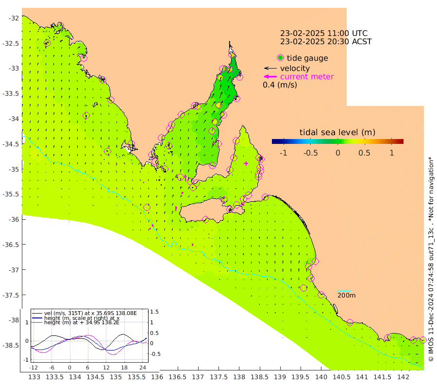0cm/s 85T +10cm/s rms + 5cm/s 114T. SAM1DS 520m 3cm/s -40T +13cm/s rms + 5cm/s -36T. SAM2CP 100m 7cm/s -24T +21cm/s rms + 18cm/s 142T. SAM3MS 168m 7cm/s -10T +22cm/s rms + 0cm/s -30T. SAM4CY 117m 2cm/s -27T +23cm/s rms + 2cm/s 99T. SAM5CB 94m 7cm/s 23T +8cm/s rms + 3cm/s -172T. SAM6IS 83m 4cm/s -25T +11cm/s rms + 7cm/s 150T. SAM7DS 519m 20cm/s -3T +10cm/s rms + 2cm/s 87T. SAM8SG 47m 14cm/s 6T +20cm/s rms + 12cm/s -168T. NRSKAI 101m 20cm Warrnambool 18cm Port Fairy 22cm Portland 17cm Port Macdonnell 24cm Beachport 24cm Cape Rabelais (off) 21cm Robe 20cm Cape Jaffa 20cm Kingston 26cm Victor Harbor 25cm Vivonne Bay 28cm Kingscote 28cm American River 29cm Penneshaw 27cm Cape Jervis 30cm Second Valley 28cm Port Noarlunga 30cm Port Stanvac 32cm Brighton 31cm Glenelg 31cm Port Adelaide (Outer Harbor) 36cm Angus Inlet (Garden Island) 34cm Ardrossan 30cm Port Vincent 29cm Port Giles 22cm Stenhouse Bay 25cm Althorpe Island 19cm Pondalowie Bay 18cm Point Turton 18cm Port Victoria 20cm Cape Elizabeth 27cm Tiparra Reef Light 30cm Wallaroo 35cm Middle Bank 4cm Port Broughton 46cm Port Pirie 52cm Red Cliff Point (Beacon 5) 53cm Port Bonython 49cm Whyalla 45cm Western Shoal Beacon 20cm Franklin Harbor 30cm Franklin Harbor Entrance Beacon 29cm Arno Bay 32cm Port Neill 28cm Cape Hardy 28cm Tumby Bay 25cm Reevesby Island 26cm Port Lincoln 26cm Taylors Landing 21cm Whalers Bay 24cm Wedge Island Mooring 26cm Shelf Edge Mooring 22cm Coffin Bay Entrance Beacon 22cm Greenly Island 22cm Elliston 23cm Pearson Island 15cm Venus Bay 18cm Blanche Port (Streaky Bay) 19cm Thevenard 21cm St Francis Island