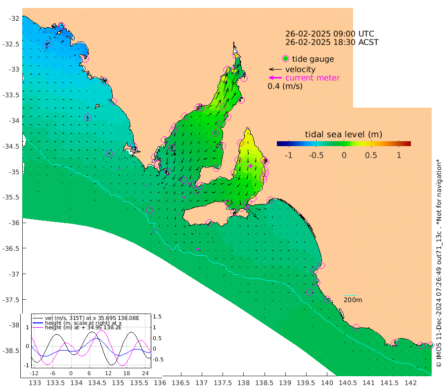 1cm/s 100T +10cm/s rms + 5cm/s 114T. SAM1DS 520m 3cm/s -109T +13cm/s rms + 5cm/s -36T. SAM2CP 100m 5cm/s -28T +21cm/s rms + 18cm/s 142T. SAM3MS 168m 9cm/s 64T +22cm/s rms + 0cm/s -30T. SAM4CY 117m 2cm/s 152T +23cm/s rms + 2cm/s 99T. SAM5CB 94m 6cm/s -105T +8cm/s rms + 3cm/s -172T. SAM6IS 83m 3cm/s -21T +11cm/s rms + 7cm/s 150T. SAM7DS 519m 5cm/s -48T +10cm/s rms + 2cm/s 87T. SAM8SG 47m 1cm/s -116T +20cm/s rms + 12cm/s -168T. NRSKAI 101m -20cm Warrnambool -21cm Port Fairy -21cm Portland -25cm Port Macdonnell -21cm Beachport -25cm Cape Rabelais (off) -25cm Robe -29cm Cape Jaffa -29cm Kingston -23cm Victor Harbor -21cm Vivonne Bay 5cm Kingscote 4cm American River -1cm Penneshaw 7cm Cape Jervis 19cm Second Valley 26cm Port Noarlunga 29cm Port Stanvac 30cm Brighton 29cm Glenelg 39cm Port Adelaide (Outer Harbor) 50cm Angus Inlet (Garden Island) 49cm Ardrossan 16cm Port Vincent 22cm Port Giles -21cm Stenhouse Bay -22cm Althorpe Island -25cm Pondalowie Bay -19cm Point Turton -17cm Port Victoria -12cm Cape Elizabeth -7cm Tiparra Reef Light 1cm Wallaroo 10cm Middle Bank -30cm Port Broughton 25cm Port Pirie 44cm Red Cliff Point (Beacon 5) 27cm Port Bonython 33cm Whyalla 29cm Western Shoal Beacon 5cm Franklin Harbor 0cm Franklin Harbor Entrance Beacon -10cm Arno Bay -19cm Port Neill -17cm Cape Hardy -21cm Tumby Bay -23cm Reevesby Island -27cm Port Lincoln -28cm Taylors Landing -20cm Whalers Bay -25cm Wedge Island Mooring -24cm Shelf Edge Mooring -38cm Coffin Bay Entrance Beacon -28cm Greenly Island -39cm Elliston -42cm Pearson Island -36cm Venus Bay -62cm Blanche Port (Streaky Bay) -59cm Thevenard -52cm St Francis Island
