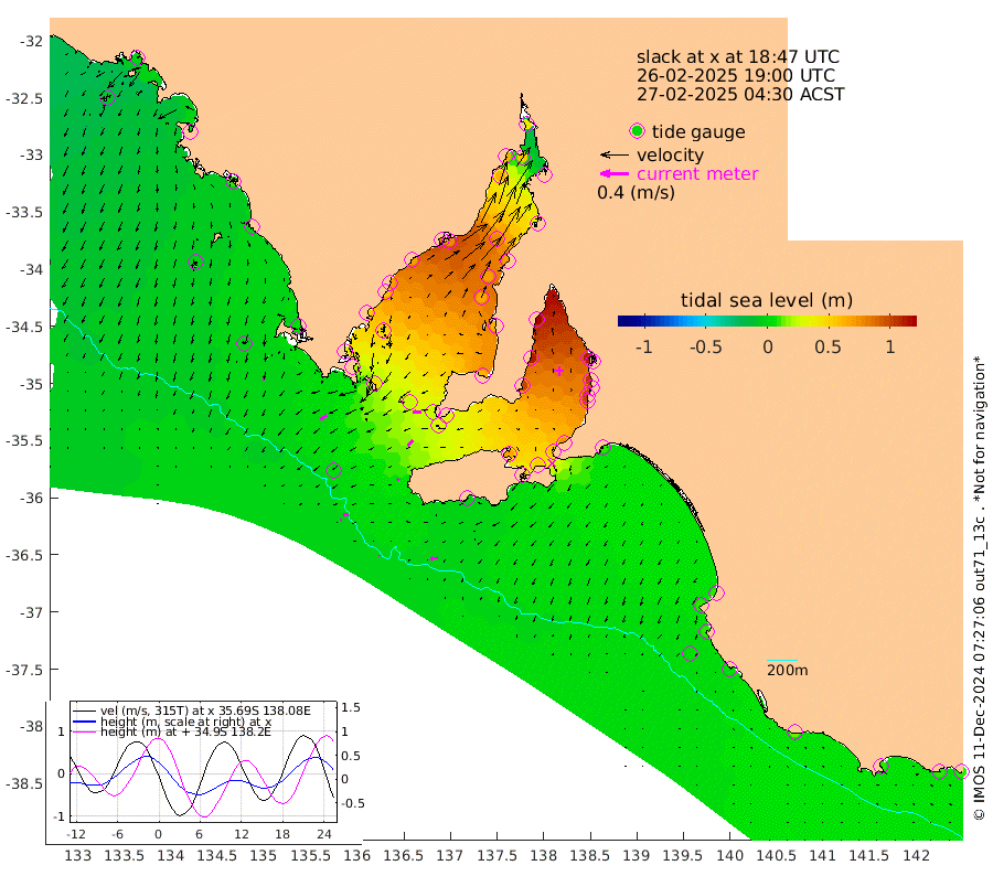 1cm/s -81T +10cm/s rms + 5cm/s 114T. SAM1DS 520m 10cm/s -124T +13cm/s rms + 5cm/s -36T. SAM2CP 100m 6cm/s -96T +21cm/s rms + 18cm/s 142T. SAM3MS 168m 11cm/s -95T +22cm/s rms + 0cm/s -30T. SAM4CY 117m 7cm/s -163T +23cm/s rms + 2cm/s 99T. SAM5CB 94m 10cm/s -133T +8cm/s rms + 3cm/s -172T. SAM6IS 83m 2cm/s -107T +11cm/s rms + 7cm/s 150T. SAM7DS 519m 12cm/s -89T +10cm/s rms + 2cm/s 87T. SAM8SG 47m 3cm/s -144T +20cm/s rms + 12cm/s -168T. NRSKAI 101m 11cm Warrnambool 10cm Port Fairy 8cm Portland 15cm Port Macdonnell 5cm Beachport 6cm Cape Rabelais (off) 8cm Robe 10cm Cape Jaffa 8cm Kingston 11cm Victor Harbor -3cm Vivonne Bay 66cm Kingscote 60cm American River 52cm Penneshaw 56cm Cape Jervis 73cm Second Valley 94cm Port Noarlunga 98cm Port Stanvac 97cm Brighton 101cm Glenelg 111cm Port Adelaide (Outer Harbor) 102cm Angus Inlet (Garden Island) 133cm Ardrossan 112cm Port Vincent 99cm Port Giles 31cm Stenhouse Bay 31cm Althorpe Island 26cm Pondalowie Bay 61cm Point Turton 62cm Port Victoria 67cm Cape Elizabeth 68cm Tiparra Reef Light 69cm Wallaroo 75cm Middle Bank 31cm Port Broughton 39cm Port Pirie 38cm Red Cliff Point (Beacon 5) 53cm Port Bonython 61cm Whyalla 61cm Western Shoal Beacon 78cm Franklin Harbor 78cm Franklin Harbor Entrance Beacon 68cm Arno Bay 69cm Port Neill 59cm Cape Hardy 51cm Tumby Bay 45cm Reevesby Island 36cm Port Lincoln 20cm Taylors Landing 47cm Whalers Bay 26cm Wedge Island Mooring 3cm Shelf Edge Mooring 5cm Coffin Bay Entrance Beacon -2cm Greenly Island 0cm Elliston -3cm Pearson Island 11cm Venus Bay 2cm Blanche Port (Streaky Bay) -3cm Thevenard -4cm St Francis Island