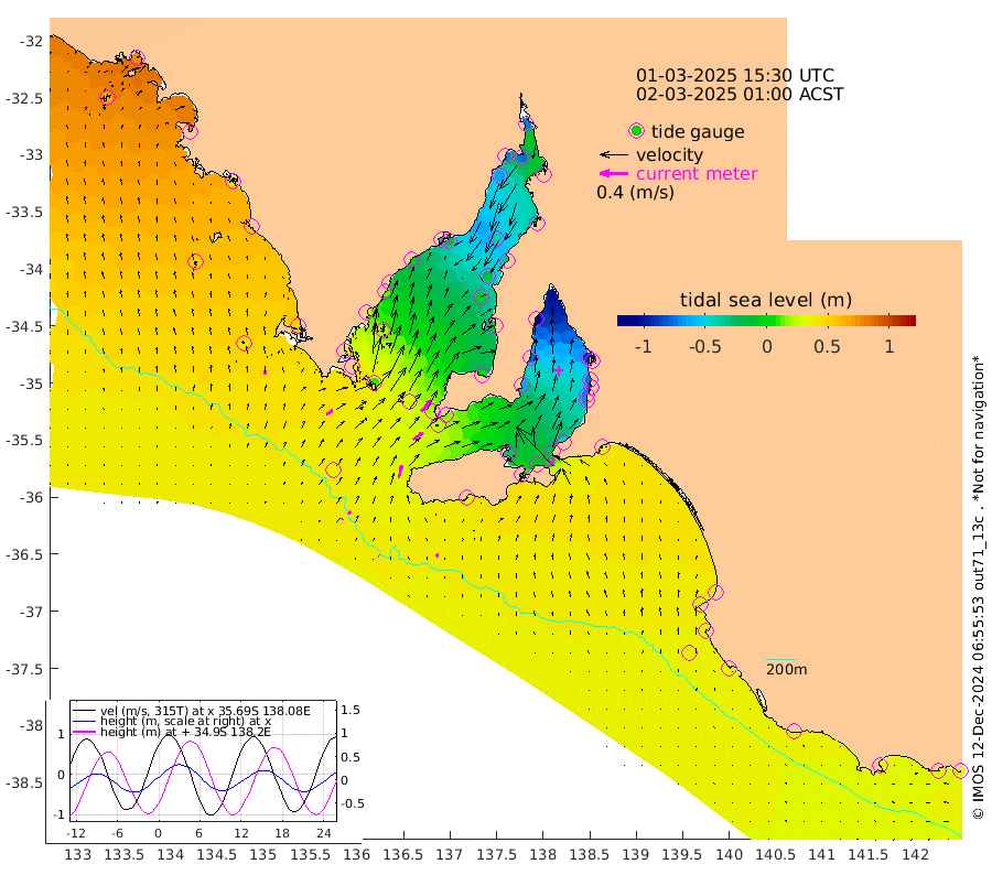 1cm/s -56T +10cm/s rms + 5cm/s 114T. SAM1DS 520m 10cm/s 54T +13cm/s rms + 5cm/s -36T. SAM2CP 100m 5cm/s 58T +21cm/s rms + 18cm/s 142T. SAM3MS 168m 5cm/s -15T +22cm/s rms + 0cm/s -30T. SAM4CY 117m 6cm/s 2T +23cm/s rms + 2cm/s 99T. SAM5CB 94m 17cm/s 54T +8cm/s rms + 3cm/s -172T. SAM6IS 83m 1cm/s 53T +11cm/s rms + 7cm/s 150T. SAM7DS 519m 21cm/s 40T +10cm/s rms + 2cm/s 87T. SAM8SG 47m 18cm/s 15T +20cm/s rms + 12cm/s -168T. NRSKAI 101m 32cm Warrnambool 32cm Port Fairy 34cm Portland 33cm Port Macdonnell 34cm Beachport 37cm Cape Rabelais (off) 36cm Robe 41cm Cape Jaffa 40cm Kingston 36cm Victor Harbor 38cm Vivonne Bay -32cm Kingscote -28cm American River -10cm Penneshaw -25cm Cape Jervis -48cm Second Valley -70cm Port Noarlunga -74cm Port Stanvac -77cm Brighton -77cm Glenelg -93cm Port Adelaide (Outer Harbor) -111cm Angus Inlet (Garden Island) -114cm Ardrossan -75cm Port Vincent -62cm Port Giles 18cm Stenhouse Bay 20cm Althorpe Island 20cm Pondalowie Bay 0cm Point Turton -1cm Port Victoria -6cm Cape Elizabeth -15cm Tiparra Reef Light -32cm Wallaroo -39cm Middle Bank -10cm Port Broughton -63cm Port Pirie -71cm Red Cliff Point (Beacon 5) -75cm Port Bonython -73cm Whyalla -64cm Western Shoal Beacon -35cm Franklin Harbor -14cm Franklin Harbor Entrance Beacon -1cm Arno Bay 7cm Port Neill 14cm Cape Hardy 23cm Tumby Bay 20cm Reevesby Island 32cm Port Lincoln 38cm Taylors Landing 11cm Whalers Bay 29cm Wedge Island Mooring 37cm Shelf Edge Mooring 50cm Coffin Bay Entrance Beacon 44cm Greenly Island 55cm Elliston 52cm Pearson Island 39cm Venus Bay 76cm Blanche Port (Streaky Bay) 76cm Thevenard 64cm St Francis Island