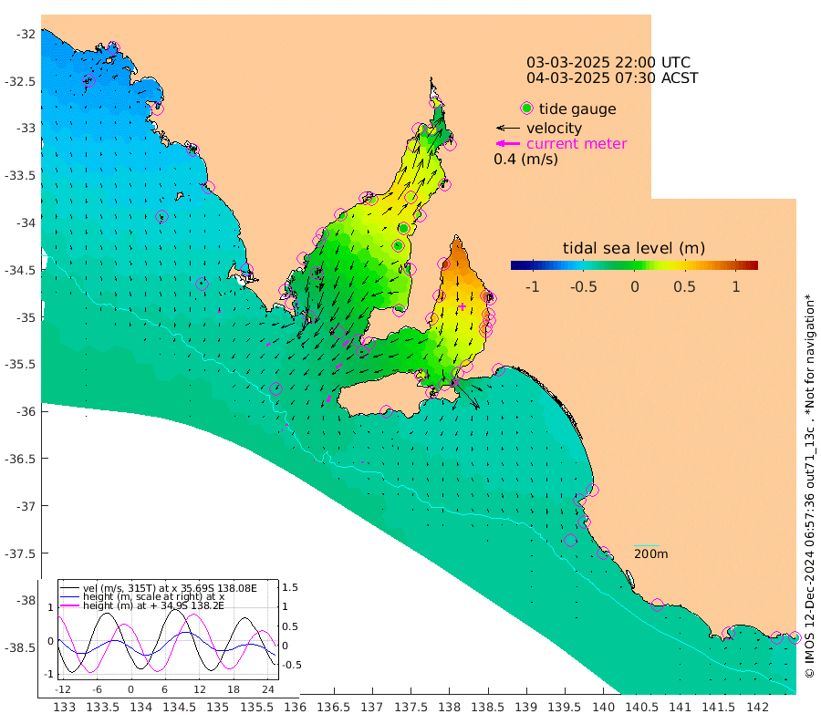 1cm/s 116T +10cm/s rms + 5cm/s 114T. SAM1DS 520m 7cm/s -124T +13cm/s rms + 5cm/s -36T. SAM2CP 100m 3cm/s -83T +21cm/s rms + 18cm/s 142T. SAM3MS 168m 2cm/s 152T +22cm/s rms + 0cm/s -30T. SAM4CY 117m 4cm/s 178T +23cm/s rms + 2cm/s 99T. SAM5CB 94m 12cm/s -125T +8cm/s rms + 3cm/s -172T. SAM6IS 83m 1cm/s -84T +11cm/s rms + 7cm/s 150T. SAM7DS 519m 13cm/s -137T +10cm/s rms + 2cm/s 87T. SAM8SG 47m 11cm/s -163T +20cm/s rms + 12cm/s -168T. NRSKAI 101m -40cm Warrnambool -38cm Port Fairy -39cm Portland -36cm Port Macdonnell -36cm Beachport -38cm Cape Rabelais (off) -38cm Robe -39cm Cape Jaffa -41cm Kingston -35cm Victor Harbor -37cm Vivonne Bay 29cm Kingscote 23cm American River 8cm Penneshaw 21cm Cape Jervis 44cm Second Valley 63cm Port Noarlunga 67cm Port Stanvac 72cm Brighton 72cm Glenelg 84cm Port Adelaide (Outer Harbor) 93cm Angus Inlet (Garden Island) 104cm Ardrossan 74cm Port Vincent 58cm Port Giles -17cm Stenhouse Bay -20cm Althorpe Island -20cm Pondalowie Bay -6cm Point Turton -1cm Port Victoria 5cm Cape Elizabeth 0cm Tiparra Reef Light 12cm Wallaroo 21cm Middle Bank -6cm Port Broughton 22cm Port Pirie 36cm Red Cliff Point (Beacon 5) 35cm Port Bonython 37cm Whyalla 30cm Western Shoal Beacon 24cm Franklin Harbor 12cm Franklin Harbor Entrance Beacon 0cm Arno Bay -7cm Port Neill -12cm Cape Hardy -17cm Tumby Bay -22cm Reevesby Island -28cm Port Lincoln -32cm Taylors Landing -12cm Whalers Bay -26cm Wedge Island Mooring -34cm Shelf Edge Mooring -45cm Coffin Bay Entrance Beacon -39cm Greenly Island -46cm Elliston -45cm Pearson Island -37cm Venus Bay -65cm Blanche Port (Streaky Bay) -64cm Thevenard -64cm St Francis Island