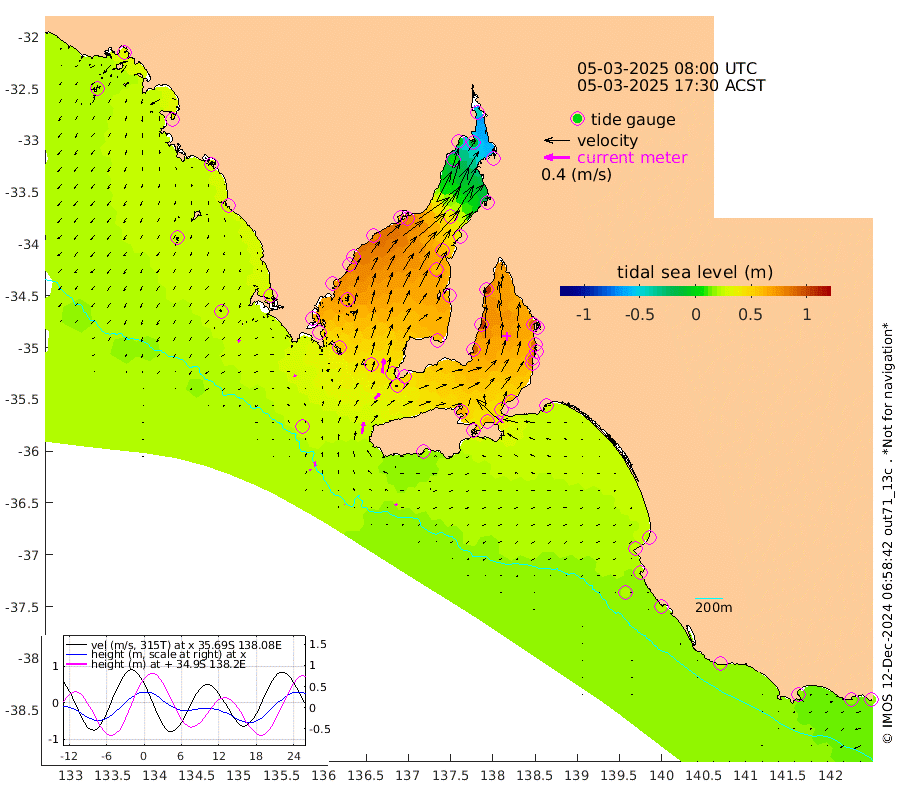 0cm/s 42T +10cm/s rms + 5cm/s 114T. SAM1DS 520m 3cm/s -69T +13cm/s rms + 5cm/s -36T. SAM2CP 100m 7cm/s -13T +21cm/s rms + 18cm/s 142T. SAM3MS 168m 3cm/s -41T +22cm/s rms + 0cm/s -30T. SAM4CY 117m 4cm/s -126T +23cm/s rms + 2cm/s 99T. SAM5CB 94m 12cm/s 43T +8cm/s rms + 3cm/s -172T. SAM6IS 83m 3cm/s 8T +11cm/s rms + 7cm/s 150T. SAM7DS 519m 22cm/s 6T +10cm/s rms + 2cm/s 87T. SAM8SG 47m 18cm/s 11T +20cm/s rms + 12cm/s -168T. NRSKAI 101m 17cm Warrnambool 17cm Port Fairy 19cm Portland 23cm Port Macdonnell 20cm Beachport 20cm Cape Rabelais (off) 22cm Robe 23cm Cape Jaffa 21cm Kingston 28cm Victor Harbor 20cm Vivonne Bay 62cm Kingscote 54cm American River 60cm Penneshaw 52cm Cape Jervis 61cm Second Valley 77cm Port Noarlunga 81cm Port Stanvac 80cm Brighton 85cm Glenelg 89cm Port Adelaide (Outer Harbor) 64cm Angus Inlet (Garden Island) 108cm Ardrossan 103cm Port Vincent 92cm Port Giles 46cm Stenhouse Bay 43cm Althorpe Island 37cm Pondalowie Bay 59cm Point Turton 59cm Port Victoria 58cm Cape Elizabeth 56cm Tiparra Reef Light 40cm Wallaroo 44cm Middle Bank -20cm Port Broughton -32cm Port Pirie -44cm Red Cliff Point (Beacon 5) -13cm Port Bonython -4cm Whyalla 5cm Western Shoal Beacon 51cm Franklin Harbor 75cm Franklin Harbor Entrance Beacon 76cm Arno Bay 82cm Port Neill 72cm Cape Hardy 69cm Tumby Bay 64cm Reevesby Island 62cm Port Lincoln 46cm Taylors Landing 55cm Whalers Bay 43cm Wedge Island Mooring 24cm Shelf Edge Mooring 29cm Coffin Bay Entrance Beacon 23cm Greenly Island 28cm Elliston 23cm Pearson Island 27cm Venus Bay 36cm Blanche Port (Streaky Bay) 33cm Thevenard 21cm St Francis Island