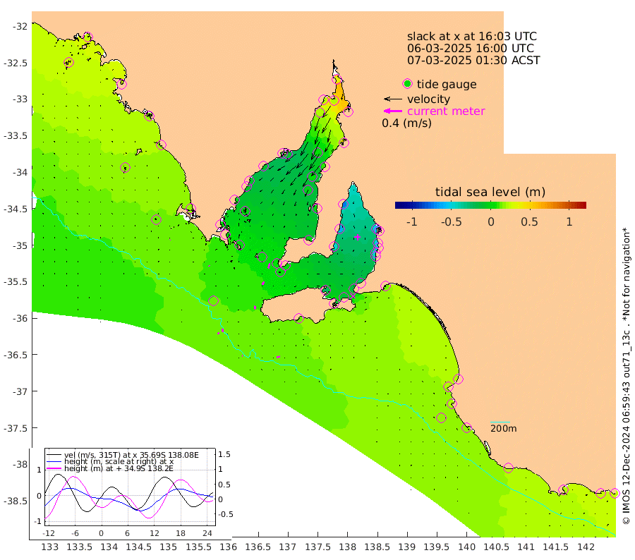 1cm/s -93T +10cm/s rms + 5cm/s 114T. SAM1DS 520m 2cm/s 154T +13cm/s rms + 5cm/s -36T. SAM2CP 100m 6cm/s -177T +21cm/s rms + 18cm/s 142T. SAM3MS 168m 8cm/s -97T +22cm/s rms + 0cm/s -30T. SAM4CY 117m 1cm/s 49T +23cm/s rms + 2cm/s 99T. SAM5CB 94m 8cm/s -145T +8cm/s rms + 3cm/s -172T. SAM6IS 83m 3cm/s -171T +11cm/s rms + 7cm/s 150T. SAM7DS 519m 11cm/s -165T +10cm/s rms + 2cm/s 87T. SAM8SG 47m 7cm/s -170T +20cm/s rms + 12cm/s -168T. NRSKAI 101m 26cm Warrnambool 23cm Port Fairy 22cm Portland 20cm Port Macdonnell 16cm Beachport 18cm Cape Rabelais (off) 20cm Robe 22cm Cape Jaffa 22cm Kingston 14cm Victor Harbor 12cm Vivonne Bay -24cm Kingscote -16cm American River -15cm Penneshaw -16cm Cape Jervis -30cm Second Valley -44cm Port Noarlunga -46cm Port Stanvac -49cm Brighton -49cm Glenelg -56cm Port Adelaide (Outer Harbor) -51cm Angus Inlet (Garden Island) -72cm Ardrossan -60cm Port Vincent -47cm Port Giles 1cm Stenhouse Bay 7cm Althorpe Island 7cm Pondalowie Bay 2cm Point Turton 0cm Port Victoria -2cm Cape Elizabeth 6cm Tiparra Reef Light 10cm Wallaroo 4cm Middle Bank 46cm Port Broughton 38cm Port Pirie 36cm Red Cliff Point (Beacon 5) 19cm Port Bonython 19cm Whyalla 20cm Western Shoal Beacon -1cm Franklin Harbor -11cm Franklin Harbor Entrance Beacon -10cm Arno Bay -8cm Port Neill -5cm Cape Hardy -3cm Tumby Bay 1cm Reevesby Island 1cm Port Lincoln 5cm Taylors Landing 3cm Whalers Bay 6cm Wedge Island Mooring 11cm Shelf Edge Mooring 18cm Coffin Bay Entrance Beacon 13cm Greenly Island 17cm Elliston 15cm Pearson Island 17cm Venus Bay 27cm Blanche Port (Streaky Bay) 25cm Thevenard 33cm St Francis Island