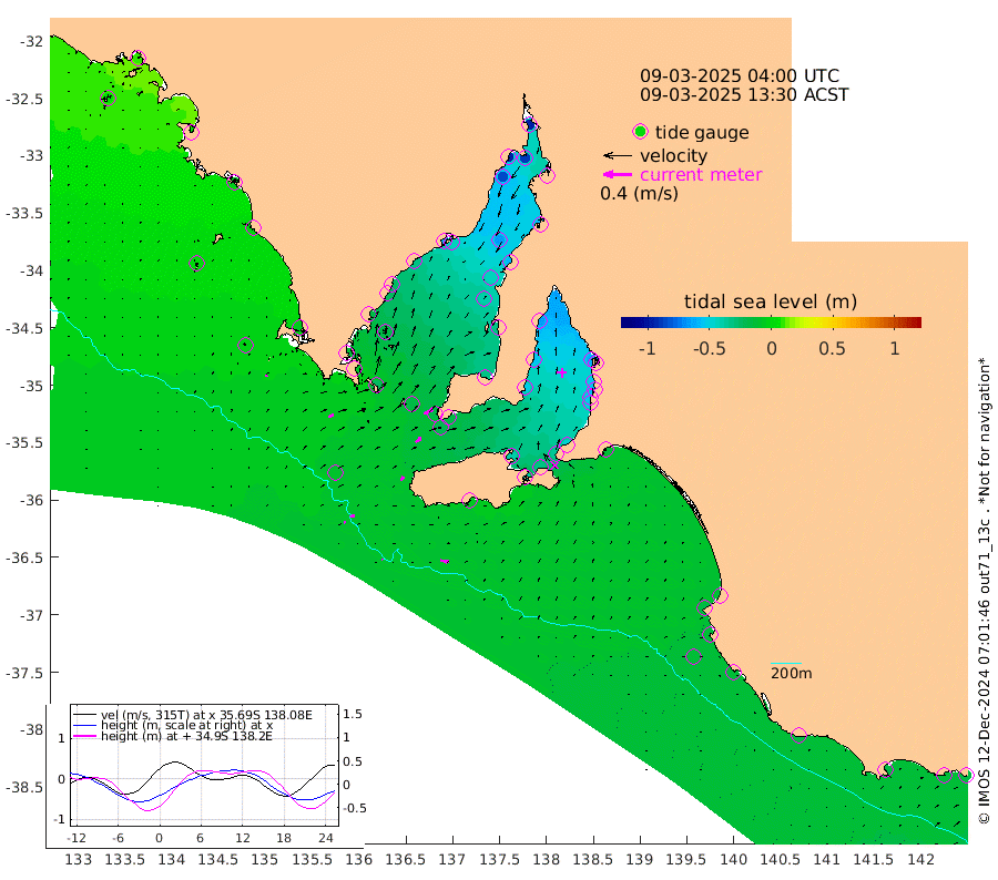 1cm/s 106T +10cm/s rms + 5cm/s 114T. SAM1DS 520m 8cm/s 61T +13cm/s rms + 5cm/s -36T. SAM2CP 100m 6cm/s 73T +21cm/s rms + 18cm/s 142T. SAM3MS 168m 12cm/s 98T +22cm/s rms + 0cm/s -30T. SAM4CY 117m 2cm/s 20T +23cm/s rms + 2cm/s 99T. SAM5CB 94m 10cm/s 50T +8cm/s rms + 3cm/s -172T. SAM6IS 83m 3cm/s 75T +11cm/s rms + 7cm/s 150T. SAM7DS 519m 13cm/s 64T +10cm/s rms + 2cm/s 87T. SAM8SG 47m 6cm/s 26T +20cm/s rms + 12cm/s -168T. NRSKAI 101m -16cm Warrnambool -14cm Port Fairy -15cm Portland -16cm Port Macdonnell -13cm Beachport -13cm Cape Rabelais (off) -14cm Robe -16cm Cape Jaffa -12cm Kingston -13cm Victor Harbor -5cm Vivonne Bay -41cm Kingscote -41cm American River -31cm Penneshaw -36cm Cape Jervis -49cm Second Valley -52cm Port Noarlunga -54cm Port Stanvac -56cm Brighton -55cm Glenelg -60cm Port Adelaide (Outer Harbor) -68cm Angus Inlet (Garden Island) -66cm Ardrossan -53cm Port Vincent -50cm Port Giles -18cm Stenhouse Bay -22cm Althorpe Island -17cm Pondalowie Bay -33cm Point Turton -32cm Port Victoria -38cm Cape Elizabeth -44cm Tiparra Reef Light -59cm Wallaroo -65cm Middle Bank -57cm Port Broughton -95cm Port Pirie -97cm Red Cliff Point (Beacon 5) -88cm Port Bonython -94cm Whyalla -86cm Western Shoal Beacon -59cm Franklin Harbor -43cm Franklin Harbor Entrance Beacon -31cm Arno Bay -26cm Port Neill -23cm Cape Hardy -18cm Tumby Bay -16cm Reevesby Island -12cm Port Lincoln -9cm Taylors Landing -26cm Whalers Bay -16cm Wedge Island Mooring -10cm Shelf Edge Mooring -4cm Coffin Bay Entrance Beacon -3cm Greenly Island -3cm Elliston 1cm Pearson Island -7cm Venus Bay 6cm Blanche Port (Streaky Bay) 10cm Thevenard 6cm St Francis Island