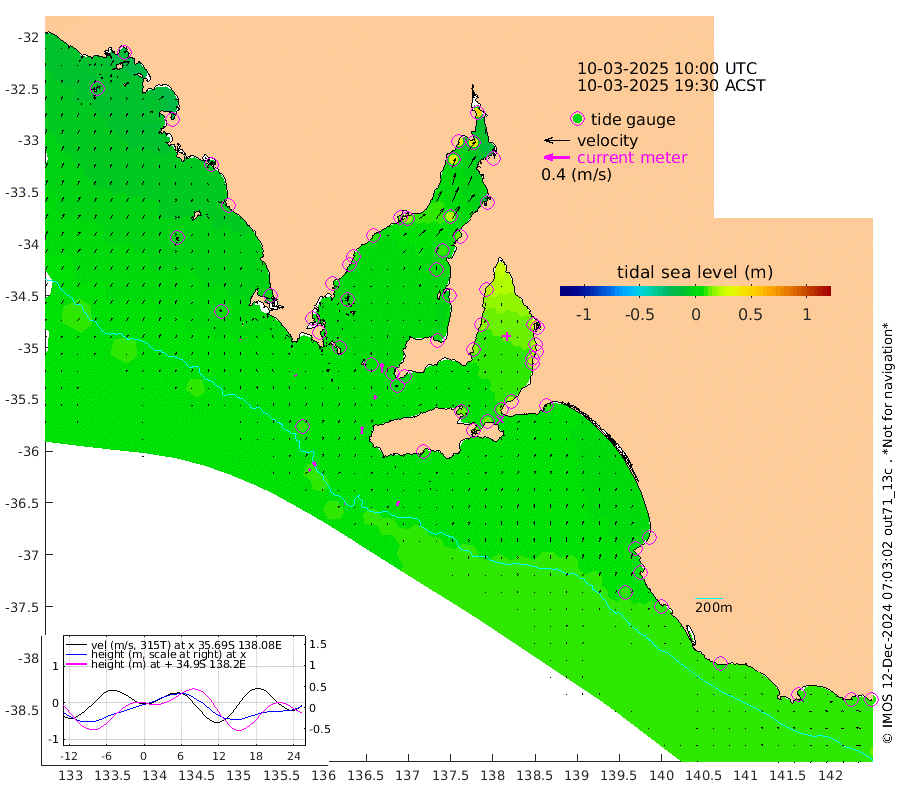 1cm/s 103T +10cm/s rms + 5cm/s 114T. SAM1DS 520m 2cm/s -31T +13cm/s rms + 5cm/s -36T. SAM2CP 100m 7cm/s -24T +21cm/s rms + 18cm/s 142T. SAM3MS 168m 7cm/s 18T +22cm/s rms + 0cm/s -30T. SAM4CY 117m 1cm/s 2T +23cm/s rms + 2cm/s 99T. SAM5CB 94m 6cm/s 17T +8cm/s rms + 3cm/s -172T. SAM6IS 83m 4cm/s -22T +11cm/s rms + 7cm/s 150T. SAM7DS 519m 15cm/s -1T +10cm/s rms + 2cm/s 87T. SAM8SG 47m 10cm/s 4T +20cm/s rms + 12cm/s -168T. NRSKAI 101m 9cm Warrnambool 8cm Port Fairy 9cm Portland 4cm Port Macdonnell 10cm Beachport 8cm Cape Rabelais (off) 6cm Robe 4cm Cape Jaffa 5cm Kingston 9cm Victor Harbor 9cm Vivonne Bay 15cm Kingscote 13cm American River 14cm Penneshaw 14cm Cape Jervis 20cm Second Valley 18cm Port Noarlunga 19cm Port Stanvac 21cm Brighton 20cm Glenelg 23cm Port Adelaide (Outer Harbor) 28cm Angus Inlet (Garden Island) 24cm Ardrossan 15cm Port Vincent 17cm Port Giles 4cm Stenhouse Bay 5cm Althorpe Island 1cm Pondalowie Bay 1cm Point Turton 0cm Port Victoria 6cm Cape Elizabeth 8cm Tiparra Reef Light 13cm Wallaroo 20cm Middle Bank -14cm Port Broughton 34cm Port Pirie 48cm Red Cliff Point (Beacon 5) 39cm Port Bonython 38cm Whyalla 31cm Western Shoal Beacon 12cm Franklin Harbor 15cm Franklin Harbor Entrance Beacon 10cm Arno Bay 10cm Port Neill 7cm Cape Hardy 6cm Tumby Bay 3cm Reevesby Island 4cm Port Lincoln 5cm Taylors Landing 1cm Whalers Bay 5cm Wedge Island Mooring 9cm Shelf Edge Mooring 0cm Coffin Bay Entrance Beacon 4cm Greenly Island -2cm Elliston -2cm Pearson Island -6cm Venus Bay -14cm Blanche Port (Streaky Bay) -13cm Thevenard -8cm St Francis Island