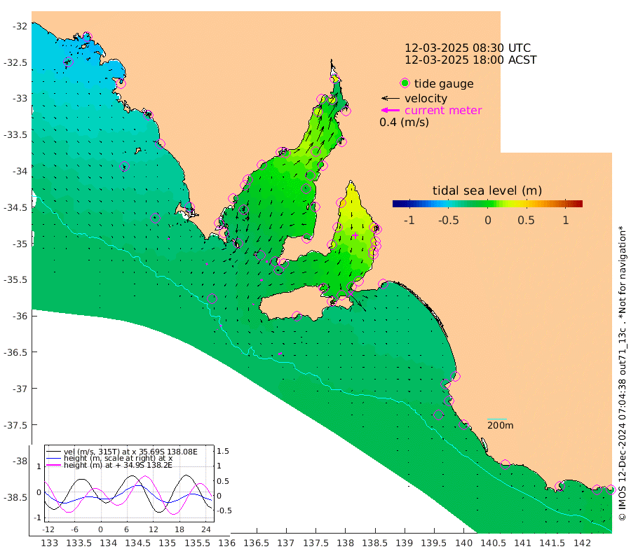 1cm/s 112T +10cm/s rms + 5cm/s 114T. SAM1DS 520m 4cm/s -119T +13cm/s rms + 5cm/s -36T. SAM2CP 100m 3cm/s -19T +21cm/s rms + 18cm/s 142T. SAM3MS 168m 7cm/s 71T +22cm/s rms + 0cm/s -30T. SAM4CY 117m 3cm/s 168T +23cm/s rms + 2cm/s 99T. SAM5CB 94m 5cm/s -111T +8cm/s rms + 3cm/s -172T. SAM6IS 83m 2cm/s -2T +11cm/s rms + 7cm/s 150T. SAM7DS 519m 4cm/s -97T +10cm/s rms + 2cm/s 87T. SAM8SG 47m 3cm/s -149T +20cm/s rms + 12cm/s -168T. NRSKAI 101m -19cm Warrnambool -21cm Port Fairy -21cm Portland -25cm Port Macdonnell -22cm Beachport -24cm Cape Rabelais (off) -24cm Robe -29cm Cape Jaffa -26cm Kingston -23cm Victor Harbor -22cm Vivonne Bay 6cm Kingscote 5cm American River 0cm Penneshaw 7cm Cape Jervis 19cm Second Valley 27cm Port Noarlunga 30cm Port Stanvac 31cm Brighton 33cm Glenelg 40cm Port Adelaide (Outer Harbor) 50cm Angus Inlet (Garden Island) 51cm Ardrossan 20cm Port Vincent 25cm Port Giles -17cm Stenhouse Bay -16cm Althorpe Island -20cm Pondalowie Bay -13cm Point Turton -13cm Port Victoria -10cm Cape Elizabeth -1cm Tiparra Reef Light 4cm Wallaroo 10cm Middle Bank -22cm Port Broughton 19cm Port Pirie 37cm Red Cliff Point (Beacon 5) 26cm Port Bonython 28cm Whyalla 26cm Western Shoal Beacon 4cm Franklin Harbor 2cm Franklin Harbor Entrance Beacon -5cm Arno Bay -7cm Port Neill -12cm Cape Hardy -16cm Tumby Bay -19cm Reevesby Island -23cm Port Lincoln -26cm Taylors Landing -16cm Whalers Bay -23cm Wedge Island Mooring -24cm Shelf Edge Mooring -34cm Coffin Bay Entrance Beacon -29cm Greenly Island -36cm Elliston -38cm Pearson Island -31cm Venus Bay -55cm Blanche Port (Streaky Bay) -52cm Thevenard -45cm St Francis Island
