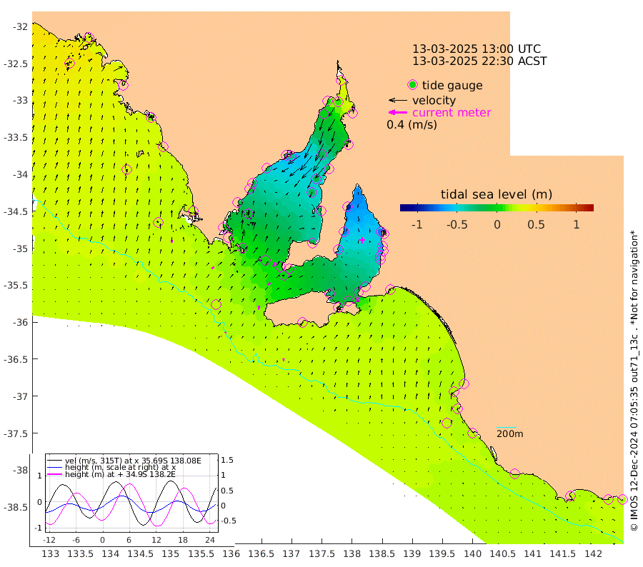 0cm/s -83T +10cm/s rms + 5cm/s 114T. SAM1DS 520m 6cm/s 54T +13cm/s rms + 5cm/s -36T. SAM2CP 100m 2cm/s 27T +21cm/s rms + 18cm/s 142T. SAM3MS 168m 6cm/s -1T +22cm/s rms + 0cm/s -30T. SAM4CY 117m 6cm/s 10T +23cm/s rms + 2cm/s 99T. SAM5CB 94m 7cm/s 47T +8cm/s rms + 3cm/s -172T. SAM6IS 83m 1cm/s -42T +11cm/s rms + 7cm/s 150T. SAM7DS 519m 9cm/s 31T +10cm/s rms + 2cm/s 87T. SAM8SG 47m 8cm/s 10T +20cm/s rms + 12cm/s -168T. NRSKAI 101m 22cm Warrnambool 21cm Port Fairy 23cm Portland 17cm Port Macdonnell 23cm Beachport 24cm Cape Rabelais (off) 21cm Robe 22cm Cape Jaffa 23cm Kingston 20cm Victor Harbor 25cm Vivonne Bay -32cm Kingscote -24cm American River -18cm Penneshaw -23cm Cape Jervis -38cm Second Valley -59cm Port Noarlunga -62cm Port Stanvac -62cm Brighton -66cm Glenelg -75cm Port Adelaide (Outer Harbor) -68cm Angus Inlet (Garden Island) -94cm Ardrossan -73cm Port Vincent -63cm Port Giles -2cm Stenhouse Bay 4cm Althorpe Island 2cm Pondalowie Bay -21cm Point Turton -23cm Port Victoria -22cm Cape Elizabeth -20cm Tiparra Reef Light -17cm Wallaroo -20cm Middle Bank 11cm Port Broughton 22cm Port Pirie 30cm Red Cliff Point (Beacon 5) 10cm Port Bonython 2cm Whyalla -2cm Western Shoal Beacon -33cm Franklin Harbor -31cm Franklin Harbor Entrance Beacon -25cm Arno Bay -20cm Port Neill -14cm Cape Hardy -9cm Tumby Bay -9cm Reevesby Island -2cm Port Lincoln 10cm Taylors Landing -11cm Whalers Bay 6cm Wedge Island Mooring 23cm Shelf Edge Mooring 23cm Coffin Bay Entrance Beacon 24cm Greenly Island 26cm Elliston 30cm Pearson Island 14cm Venus Bay 29cm Blanche Port (Streaky Bay) 30cm Thevenard 39cm St Francis Island