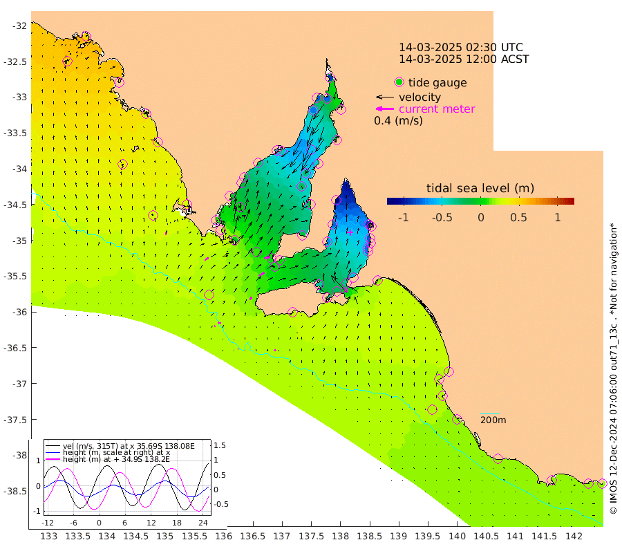 1cm/s 93T +10cm/s rms + 5cm/s 114T. SAM1DS 520m 10cm/s 59T +13cm/s rms + 5cm/s -36T. SAM2CP 100m 6cm/s 109T +21cm/s rms + 18cm/s 142T. SAM3MS 168m 4cm/s 138T +22cm/s rms + 0cm/s -30T. SAM4CY 117m 5cm/s -1T +23cm/s rms + 2cm/s 99T. SAM5CB 94m 14cm/s 59T +8cm/s rms + 3cm/s -172T. SAM6IS 83m 2cm/s 111T +11cm/s rms + 7cm/s 150T. SAM7DS 519m 13cm/s 78T +10cm/s rms + 2cm/s 87T. SAM8SG 47m 7cm/s 30T +20cm/s rms + 12cm/s -168T. NRSKAI 101m 16cm Warrnambool 17cm Port Fairy 18cm Portland 18cm Port Macdonnell 18cm Beachport 19cm Cape Rabelais (off) 19cm Robe 20cm Cape Jaffa 20cm Kingston 16cm Victor Harbor 23cm Vivonne Bay -41cm Kingscote -38cm American River -25cm Penneshaw -36cm Cape Jervis -57cm Second Valley -73cm Port Noarlunga -78cm Port Stanvac -80cm Brighton -83cm Glenelg -94cm Port Adelaide (Outer Harbor) -104cm Angus Inlet (Garden Island) -113cm Ardrossan -76cm Port Vincent -70cm Port Giles 4cm Stenhouse Bay 2cm Althorpe Island 6cm Pondalowie Bay -15cm Point Turton -18cm Port Victoria -26cm Cape Elizabeth -33cm Tiparra Reef Light -45cm Wallaroo -55cm Middle Bank -15cm Port Broughton -67cm Port Pirie -88cm Red Cliff Point (Beacon 5) -77cm Port Bonython -81cm Whyalla -75cm Western Shoal Beacon -48cm Franklin Harbor -39cm Franklin Harbor Entrance Beacon -25cm Arno Bay -20cm Port Neill -13cm Cape Hardy -6cm Tumby Bay 1cm Reevesby Island 9cm Port Lincoln 17cm Taylors Landing -7cm Whalers Bay 9cm Wedge Island Mooring 20cm Shelf Edge Mooring 29cm Coffin Bay Entrance Beacon 28cm Greenly Island 33cm Elliston 36cm Pearson Island 23cm Venus Bay 51cm Blanche Port (Streaky Bay) 52cm Thevenard 52cm St Francis Island