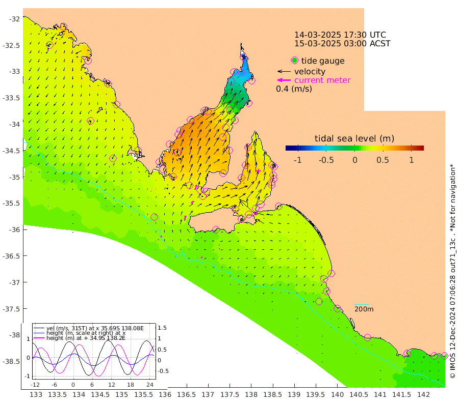 1cm/s -59T +10cm/s rms + 5cm/s 114T. SAM1DS 520m 1cm/s -19T +13cm/s rms + 5cm/s -36T. SAM2CP 100m 4cm/s 17T +21cm/s rms + 18cm/s 142T. SAM3MS 168m 5cm/s -96T +22cm/s rms + 0cm/s -30T. SAM4CY 117m 4cm/s -146T +23cm/s rms + 2cm/s 99T. SAM5CB 94m 9cm/s 55T +8cm/s rms + 3cm/s -172T. SAM6IS 83m 2cm/s 40T +11cm/s rms + 7cm/s 150T. SAM7DS 519m 16cm/s 20T +10cm/s rms + 2cm/s 87T. SAM8SG 47m 14cm/s 13T +20cm/s rms + 12cm/s -168T. NRSKAI 101m 11cm Warrnambool 12cm Port Fairy 12cm Portland 20cm Port Macdonnell 13cm Beachport 16cm Cape Rabelais (off) 17cm Robe 21cm Cape Jaffa 20cm Kingston 22cm Victor Harbor 13cm Vivonne Bay 40cm Kingscote 33cm American River 41cm Penneshaw 31cm Cape Jervis 32cm Second Valley 45cm Port Noarlunga 47cm Port Stanvac 44cm Brighton 50cm Glenelg 49cm Port Adelaide (Outer Harbor) 14cm Angus Inlet (Garden Island) 63cm Ardrossan 78cm Port Vincent 61cm Port Giles 38cm Stenhouse Bay 34cm Althorpe Island 32cm Pondalowie Bay 50cm Point Turton 51cm Port Victoria 51cm Cape Elizabeth 36cm Tiparra Reef Light 13cm Wallaroo 12cm Middle Bank -19cm Port Broughton -85cm Port Pirie -96cm Red Cliff Point (Beacon 5) -66cm Port Bonython -58cm Whyalla -46cm Western Shoal Beacon 29cm Franklin Harbor 55cm Franklin Harbor Entrance Beacon 62cm Arno Bay 72cm Port Neill 66cm Cape Hardy 64cm Tumby Bay 55cm Reevesby Island 56cm Port Lincoln 42cm Taylors Landing 46cm Whalers Bay 37cm Wedge Island Mooring 17cm Shelf Edge Mooring 31cm Coffin Bay Entrance Beacon 20cm Greenly Island 30cm Elliston 27cm Pearson Island 31cm Venus Bay 51cm Blanche Port (Streaky Bay) 46cm Thevenard 29cm St Francis Island