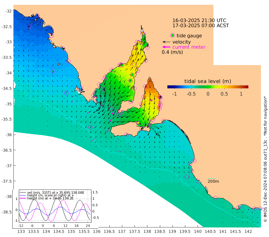 0cm/s 141T +10cm/s rms + 5cm/s 114T. SAM1DS 520m 9cm/s -127T +13cm/s rms + 5cm/s -36T. SAM2CP 100m 4cm/s -106T +21cm/s rms + 18cm/s 142T. SAM3MS 168m 3cm/s 167T +22cm/s rms + 0cm/s -30T. SAM4CY 117m 5cm/s 175T +23cm/s rms + 2cm/s 99T. SAM5CB 94m 17cm/s -126T +8cm/s rms + 3cm/s -172T. SAM6IS 83m 2cm/s -95T +11cm/s rms + 7cm/s 150T. SAM7DS 519m 19cm/s -139T +10cm/s rms + 2cm/s 87T. SAM8SG 47m 16cm/s -163T +20cm/s rms + 12cm/s -168T. NRSKAI 101m -39cm Warrnambool -38cm Port Fairy -40cm Portland -38cm Port Macdonnell -38cm Beachport -39cm Cape Rabelais (off) -40cm Robe -44cm Cape Jaffa -44cm Kingston -39cm Victor Harbor -41cm Vivonne Bay 28cm Kingscote 23cm American River 5cm Penneshaw 21cm Cape Jervis 45cm Second Valley 65cm Port Noarlunga 68cm Port Stanvac 72cm Brighton 73cm Glenelg 87cm Port Adelaide (Outer Harbor) 105cm Angus Inlet (Garden Island) 109cm Ardrossan 71cm Port Vincent 56cm Port Giles -23cm Stenhouse Bay -26cm Althorpe Island -24cm Pondalowie Bay -9cm Point Turton -6cm Port Victoria 1cm Cape Elizabeth 3cm Tiparra Reef Light 21cm Wallaroo 30cm Middle Bank 9cm Port Broughton 53cm Port Pirie 66cm Red Cliff Point (Beacon 5) 67cm Port Bonython 64cm Whyalla 52cm Western Shoal Beacon 25cm Franklin Harbor 6cm Franklin Harbor Entrance Beacon -6cm Arno Bay -15cm Port Neill -19cm Cape Hardy -27cm Tumby Bay -29cm Reevesby Island -38cm Port Lincoln -41cm Taylors Landing -18cm Whalers Bay -32cm Wedge Island Mooring -39cm Shelf Edge Mooring -54cm Coffin Bay Entrance Beacon -47cm Greenly Island -57cm Elliston -52cm Pearson Island -43cm Venus Bay -80cm Blanche Port (Streaky Bay) -81cm Thevenard -75cm St Francis Island
