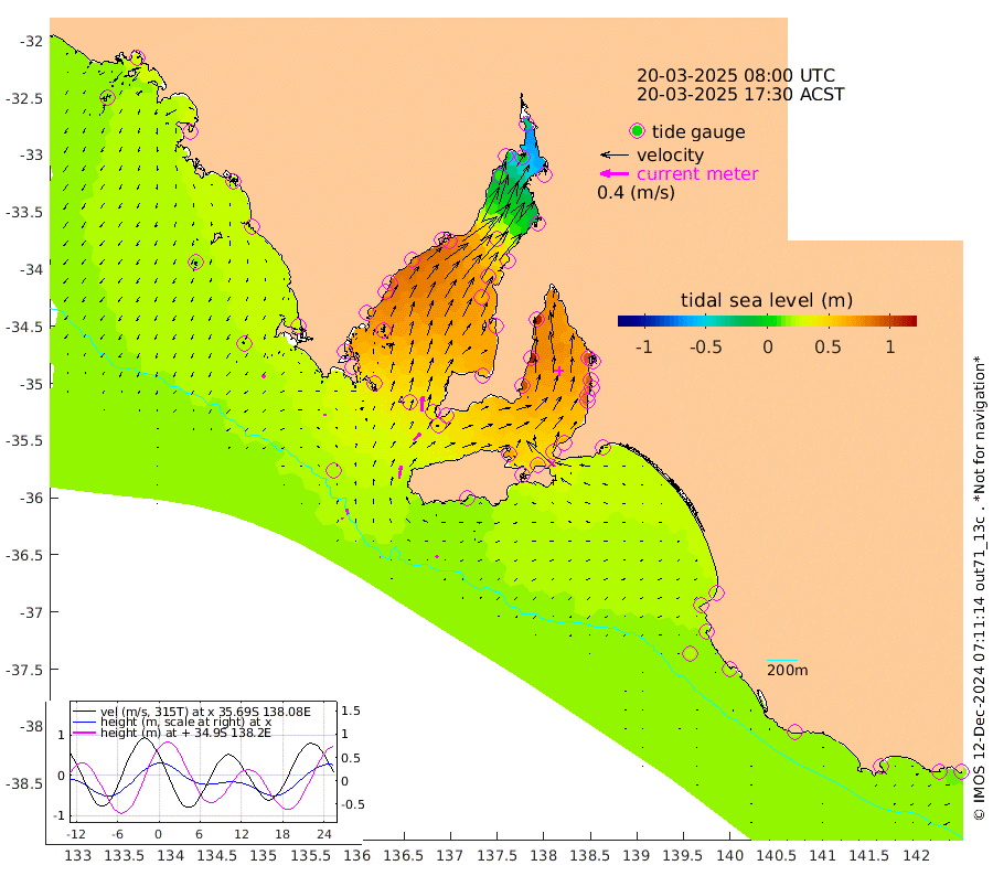 0cm/s 83T +10cm/s rms + 5cm/s 114T. SAM1DS 520m 4cm/s -80T +13cm/s rms + 5cm/s -36T. SAM2CP 100m 8cm/s -15T +21cm/s rms + 18cm/s 142T. SAM3MS 168m 4cm/s -38T +22cm/s rms + 0cm/s -30T. SAM4CY 117m 4cm/s -134T +23cm/s rms + 2cm/s 99T. SAM5CB 94m 13cm/s 46T +8cm/s rms + 3cm/s -172T. SAM6IS 83m 4cm/s 5T +11cm/s rms + 7cm/s 150T. SAM7DS 519m 22cm/s 3T +10cm/s rms + 2cm/s 87T. SAM8SG 47m 17cm/s 10T +20cm/s rms + 12cm/s -168T. NRSKAI 101m 18cm Warrnambool 17cm Port Fairy 18cm Portland 21cm Port Macdonnell 19cm Beachport 20cm Cape Rabelais (off) 20cm Robe 20cm Cape Jaffa 22cm Kingston 27cm Victor Harbor 18cm Vivonne Bay 64cm Kingscote 55cm American River 59cm Penneshaw 52cm Cape Jervis 63cm Second Valley 80cm Port Noarlunga 84cm Port Stanvac 83cm Brighton 88cm Glenelg 92cm Port Adelaide (Outer Harbor) 70cm Angus Inlet (Garden Island) 111cm Ardrossan 109cm Port Vincent 94cm Port Giles 44cm Stenhouse Bay 43cm Althorpe Island 35cm Pondalowie Bay 59cm Point Turton 57cm Port Victoria 60cm Cape Elizabeth 58cm Tiparra Reef Light 42cm Wallaroo 46cm Middle Bank -21cm Port Broughton -26cm Port Pirie -30cm Red Cliff Point (Beacon 5) -2cm Port Bonython 3cm Whyalla 10cm Western Shoal Beacon 56cm Franklin Harbor 78cm Franklin Harbor Entrance Beacon 76cm Arno Bay 87cm Port Neill 71cm Cape Hardy 67cm Tumby Bay 62cm Reevesby Island 59cm Port Lincoln 44cm Taylors Landing 52cm Whalers Bay 41cm Wedge Island Mooring 22cm Shelf Edge Mooring 28cm Coffin Bay Entrance Beacon 19cm Greenly Island 23cm Elliston 19cm Pearson Island 25cm Venus Bay 31cm Blanche Port (Streaky Bay) 28cm Thevenard 17cm St Francis Island