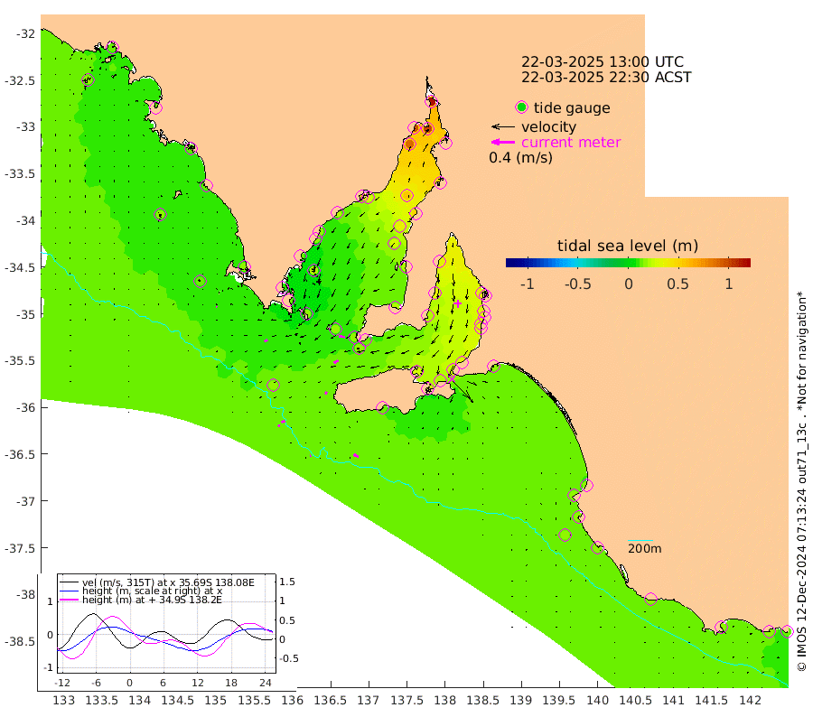 1cm/s -108T +10cm/s rms + 5cm/s 114T. SAM1DS 520m 5cm/s -119T +13cm/s rms + 5cm/s -36T. SAM2CP 100m 7cm/s -102T +21cm/s rms + 18cm/s 142T. SAM3MS 168m 9cm/s -66T +22cm/s rms + 0cm/s -30T. SAM4CY 117m 1cm/s -49T +23cm/s rms + 2cm/s 99T. SAM5CB 94m 8cm/s -117T +8cm/s rms + 3cm/s -172T. SAM6IS 83m 3cm/s -104T +11cm/s rms + 7cm/s 150T. SAM7DS 519m 11cm/s -81T +10cm/s rms + 2cm/s 87T. SAM8SG 47m 4cm/s -147T +20cm/s rms + 12cm/s -168T. NRSKAI 101m 15cm Warrnambool 16cm Port Fairy 16cm Portland 16cm Port Macdonnell 16cm Beachport 17cm Cape Rabelais (off) 15cm Robe 18cm Cape Jaffa 17cm Kingston 18cm Victor Harbor 12cm Vivonne Bay 27cm Kingscote 31cm American River 21cm Penneshaw 26cm Cape Jervis 31cm Second Valley 31cm Port Noarlunga 31cm Port Stanvac 32cm Brighton 31cm Glenelg 34cm Port Adelaide (Outer Harbor) 47cm Angus Inlet (Garden Island) 34cm Ardrossan 36cm Port Vincent 22cm Port Giles 11cm Stenhouse Bay 18cm Althorpe Island 15cm Pondalowie Bay 20cm Point Turton 21cm Port Victoria 29cm Cape Elizabeth 35cm Tiparra Reef Light 51cm Wallaroo 55cm Middle Bank 51cm Port Broughton 104cm Port Pirie 114cm Red Cliff Point (Beacon 5) 99cm Port Bonython 95cm Whyalla 86cm Western Shoal Beacon 42cm Franklin Harbor 28cm Franklin Harbor Entrance Beacon 20cm Arno Bay 18cm Port Neill 18cm Cape Hardy 15cm Tumby Bay 19cm Reevesby Island 11cm Port Lincoln 11cm Taylors Landing 18cm Whalers Bay 16cm Wedge Island Mooring 17cm Shelf Edge Mooring 16cm Coffin Bay Entrance Beacon 14cm Greenly Island 13cm Elliston 15cm Pearson Island 14cm Venus Bay 14cm Blanche Port (Streaky Bay) 11cm Thevenard 17cm St Francis Island