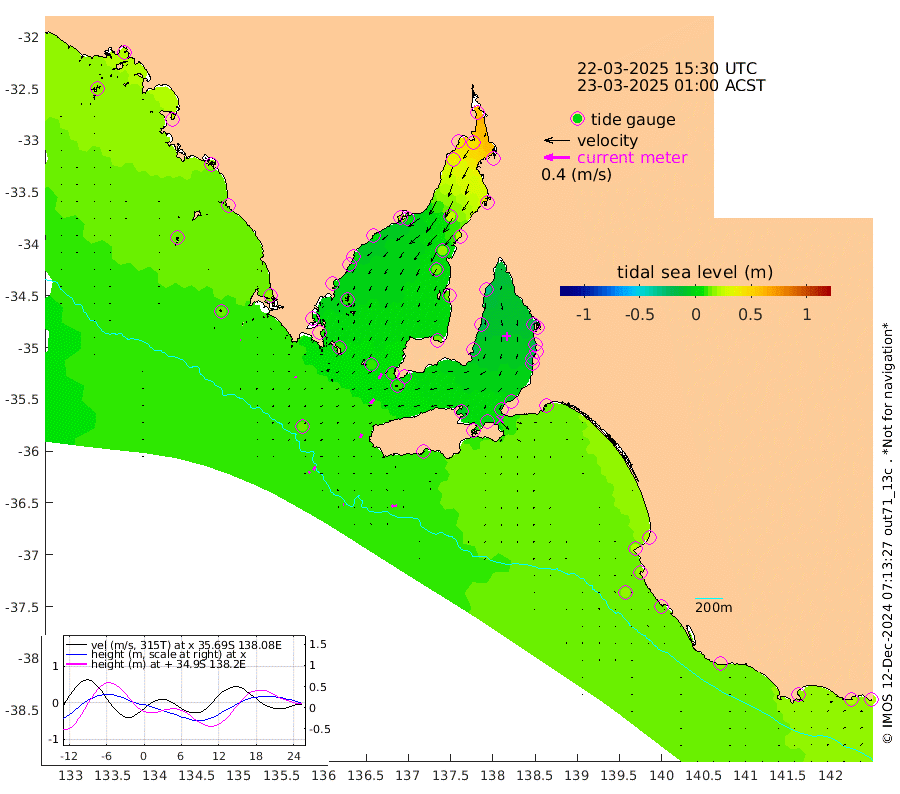 2cm/s -95T +10cm/s rms + 5cm/s 114T. SAM1DS 520m 2cm/s -159T +13cm/s rms + 5cm/s -36T. SAM2CP 100m 6cm/s -152T +21cm/s rms + 18cm/s 142T. SAM3MS 168m 8cm/s -94T +22cm/s rms + 0cm/s -30T. SAM4CY 117m 0cm/s 125T +23cm/s rms + 2cm/s 99T. SAM5CB 94m 9cm/s -132T +8cm/s rms + 3cm/s -172T. SAM6IS 83m 3cm/s -157T +11cm/s rms + 7cm/s 150T. SAM7DS 519m 9cm/s -144T +10cm/s rms + 2cm/s 87T. SAM8SG 47m 6cm/s -166T +20cm/s rms + 12cm/s -168T. NRSKAI 101m 20cm Warrnambool 19cm Port Fairy 18cm Portland 18cm Port Macdonnell 14cm Beachport 16cm Cape Rabelais (off) 17cm Robe 20cm Cape Jaffa 20cm Kingston 14cm Victor Harbor 9cm Vivonne Bay -5cm Kingscote 0cm American River -2cm Penneshaw -2cm Cape Jervis -9cm Second Valley -15cm Port Noarlunga -16cm Port Stanvac -20cm Brighton -19cm Glenelg -22cm Port Adelaide (Outer Harbor) -16cm Angus Inlet (Garden Island) -32cm Ardrossan -20cm Port Vincent -19cm Port Giles 5cm Stenhouse Bay 9cm Althorpe Island 11cm Pondalowie Bay 13cm Point Turton 13cm Port Victoria 15cm Cape Elizabeth 18cm Tiparra Reef Light 26cm Wallaroo 23cm Middle Bank 48cm Port Broughton 55cm Port Pirie 53cm Red Cliff Point (Beacon 5) 42cm Port Bonython 41cm Whyalla 38cm Western Shoal Beacon 19cm Franklin Harbor 7cm Franklin Harbor Entrance Beacon 5cm Arno Bay 3cm Port Neill 5cm Cape Hardy 5cm Tumby Bay 10cm Reevesby Island 6cm Port Lincoln 8cm Taylors Landing 9cm Whalers Bay 11cm Wedge Island Mooring 12cm Shelf Edge Mooring 17cm Coffin Bay Entrance Beacon 12cm Greenly Island 14cm Elliston 13cm Pearson Island 17cm Venus Bay 23cm Blanche Port (Streaky Bay) 21cm Thevenard 18cm St Francis Island