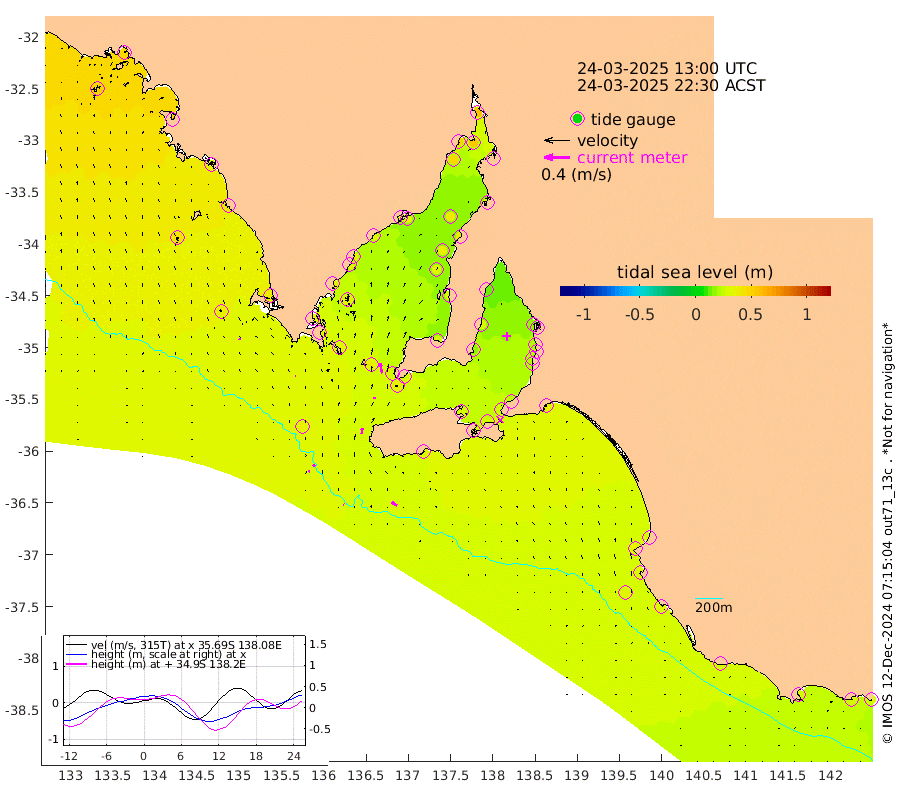 1cm/s -82T +10cm/s rms + 5cm/s 114T. SAM1DS 520m 2cm/s -77T +13cm/s rms + 5cm/s -36T. SAM2CP 100m 4cm/s -64T +21cm/s rms + 18cm/s 142T. SAM3MS 168m 9cm/s -55T +22cm/s rms + 0cm/s -30T. SAM4CY 117m 3cm/s -28T +23cm/s rms + 2cm/s 99T. SAM5CB 94m 4cm/s 5T +8cm/s rms + 3cm/s -172T. SAM6IS 83m 2cm/s -70T +11cm/s rms + 7cm/s 150T. SAM7DS 519m 15cm/s -12T +10cm/s rms + 2cm/s 87T. SAM8SG 47m 8cm/s 5T +20cm/s rms + 12cm/s -168T. NRSKAI 101m 27cm Warrnambool 28cm Port Fairy 30cm Portland 29cm Port Macdonnell 31cm Beachport 33cm Cape Rabelais (off) 31cm Robe 34cm Cape Jaffa 33cm Kingston 35cm Victor Harbor 30cm Vivonne Bay 26cm Kingscote 29cm American River 29cm Penneshaw 26cm Cape Jervis 24cm Second Valley 19cm Port Noarlunga 19cm Port Stanvac 20cm Brighton 20cm Glenelg 17cm Port Adelaide (Outer Harbor) 18cm Angus Inlet (Garden Island) 14cm Ardrossan 28cm Port Vincent 18cm Port Giles 28cm Stenhouse Bay 34cm Althorpe Island 29cm Pondalowie Bay 27cm Point Turton 29cm Port Victoria 32cm Cape Elizabeth 34cm Tiparra Reef Light 38cm Wallaroo 40cm Middle Bank 33cm Port Broughton 56cm Port Pirie 58cm Red Cliff Point (Beacon 5) 54cm Port Bonython 51cm Whyalla 49cm Western Shoal Beacon 27cm Franklin Harbor 32cm Franklin Harbor Entrance Beacon 34cm Arno Bay 37cm Port Neill 37cm Cape Hardy 38cm Tumby Bay 36cm Reevesby Island 35cm Port Lincoln 35cm Taylors Landing 32cm Whalers Bay 34cm Wedge Island Mooring 35cm Shelf Edge Mooring 39cm Coffin Bay Entrance Beacon 35cm Greenly Island 40cm Elliston 43cm Pearson Island 32cm Venus Bay 49cm Blanche Port (Streaky Bay) 47cm Thevenard 50cm St Francis Island