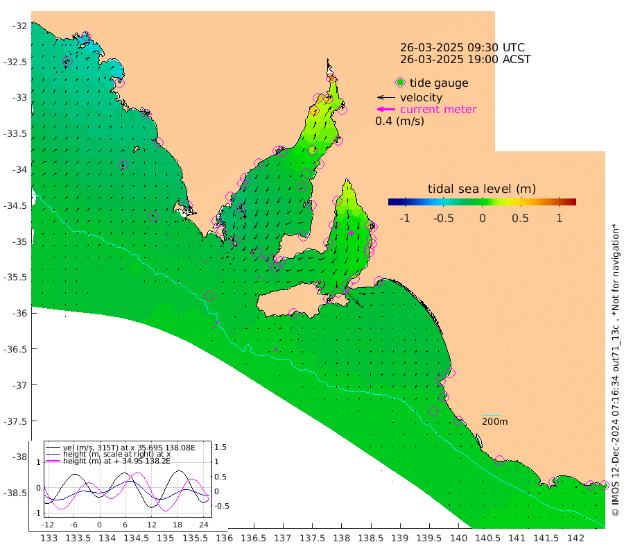 0cm/s 57T +10cm/s rms + 5cm/s 114T. SAM1DS 520m 2cm/s -92T +13cm/s rms + 5cm/s -36T. SAM2CP 100m 5cm/s -49T +21cm/s rms + 18cm/s 142T. SAM3MS 168m 6cm/s 25T +22cm/s rms + 0cm/s -30T. SAM4CY 117m 1cm/s 63T +23cm/s rms + 2cm/s 99T. SAM5CB 94m 4cm/s -81T +8cm/s rms + 3cm/s -172T. SAM6IS 83m 3cm/s -44T +11cm/s rms + 7cm/s 150T. SAM7DS 519m 5cm/s -54T +10cm/s rms + 2cm/s 87T. SAM8SG 47m 1cm/s -68T +20cm/s rms + 12cm/s -168T. NRSKAI 101m -3cm Warrnambool -4cm Port Fairy -4cm Portland -9cm Port Macdonnell -5cm Beachport -7cm Cape Rabelais (off) -8cm Robe -10cm Cape Jaffa -10cm Kingston -8cm Victor Harbor -6cm Vivonne Bay 1cm Kingscote 1cm American River -2cm Penneshaw 4cm Cape Jervis 13cm Second Valley 8cm Port Noarlunga 10cm Port Stanvac 12cm Brighton 10cm Glenelg 15cm Port Adelaide (Outer Harbor) 31cm Angus Inlet (Garden Island) 15cm Ardrossan -10cm Port Vincent 2cm Port Giles -14cm Stenhouse Bay -12cm Althorpe Island -15cm Pondalowie Bay -16cm Point Turton -16cm Port Victoria -11cm Cape Elizabeth -3cm Tiparra Reef Light 11cm Wallaroo 18cm Middle Bank 1cm Port Broughton 63cm Port Pirie 82cm Red Cliff Point (Beacon 5) 56cm Port Bonython 59cm Whyalla 51cm Western Shoal Beacon 6cm Franklin Harbor -3cm Franklin Harbor Entrance Beacon -13cm Arno Bay -19cm Port Neill -17cm Cape Hardy -19cm Tumby Bay -22cm Reevesby Island -22cm Port Lincoln -18cm Taylors Landing -16cm Whalers Bay -15cm Wedge Island Mooring -8cm Shelf Edge Mooring -21cm Coffin Bay Entrance Beacon -13cm Greenly Island -20cm Elliston -23cm Pearson Island -23cm Venus Bay -43cm Blanche Port (Streaky Bay) -40cm Thevenard -34cm St Francis Island