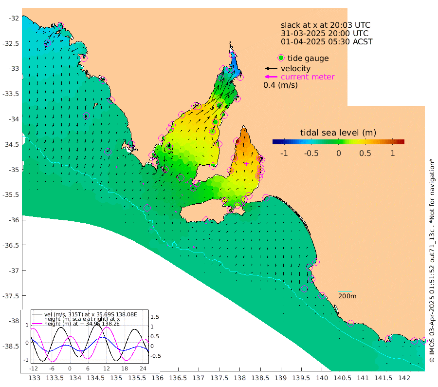0cm/s 66T +10cm/s rms + 5cm/s 114T. SAM1DS 520m 4cm/s -125T +13cm/s rms + 5cm/s -36T. SAM2CP 100m 3cm/s 18T +21cm/s rms + 18cm/s 142T. SAM3MS 168m 5cm/s 134T +22cm/s rms + 0cm/s -30T. SAM4CY 117m 6cm/s -175T +23cm/s rms + 2cm/s 99T. SAM5CB 94m 2cm/s -159T +8cm/s rms + 3cm/s -172T. SAM6IS 83m 2cm/s 38T +11cm/s rms + 7cm/s 150T. SAM7DS 519m 3cm/s -169T +10cm/s rms + 2cm/s 87T. SAM8SG 47m 3cm/s -165T +20cm/s rms + 12cm/s -168T. NRSKAI 101m -41cm Warrnambool -39cm Port Fairy -39cm Portland -33cm Port Macdonnell -35cm Beachport -36cm Cape Rabelais (off) -35cm Robe -36cm Cape Jaffa -36cm Kingston -31cm Victor Harbor -34cm Vivonne Bay 35cm Kingscote 25cm American River 18cm Penneshaw 24cm Cape Jervis 43cm Second Valley 67cm Port Noarlunga 71cm Port Stanvac 75cm Brighton 79cm Glenelg 87cm Port Adelaide (Outer Harbor) 75cm Angus Inlet (Garden Island) 113cm Ardrossan 93cm Port Vincent 74cm Port Giles -4cm Stenhouse Bay -11cm Althorpe Island -11cm Pondalowie Bay 7cm Point Turton 13cm Port Victoria 15cm Cape Elizabeth 3cm Tiparra Reef Light -3cm Wallaroo 2cm Middle Bank -36cm Port Broughton -59cm Port Pirie -55cm Red Cliff Point (Beacon 5) -37cm Port Bonython -31cm Whyalla -27cm Western Shoal Beacon 19cm Franklin Harbor 24cm Franklin Harbor Entrance Beacon 20cm Arno Bay 18cm Port Neill 10cm Cape Hardy 6cm Tumby Bay -2cm Reevesby Island -5cm Port Lincoln -16cm Taylors Landing 3cm Whalers Bay -14cm Wedge Island Mooring -32cm Shelf Edge Mooring -34cm Coffin Bay Entrance Beacon -34cm Greenly Island -35cm Elliston -37cm Pearson Island -25cm Venus Bay -42cm Blanche Port (Streaky Bay) -42cm Thevenard -53cm St Francis Island