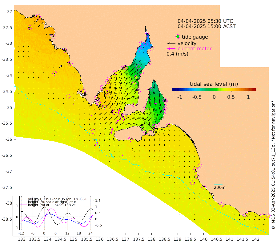 1cm/s 51T +10cm/s rms + 5cm/s 114T. SAM1DS 520m 8cm/s 33T +13cm/s rms + 5cm/s -36T. SAM2CP 100m 9cm/s 10T +21cm/s rms + 18cm/s 142T. SAM3MS 168m 6cm/s 25T +22cm/s rms + 0cm/s -30T. SAM4CY 117m 3cm/s -43T +23cm/s rms + 2cm/s 99T. SAM5CB 94m 24cm/s 46T +8cm/s rms + 3cm/s -172T. SAM6IS 83m 4cm/s 17T +11cm/s rms + 7cm/s 150T. SAM7DS 519m 34cm/s 21T +10cm/s rms + 2cm/s 87T. SAM8SG 47m 28cm/s 12T +20cm/s rms + 12cm/s -168T. NRSKAI 101m 41cm Warrnambool 39cm Port Fairy 39cm Portland 37cm Port Macdonnell 38cm Beachport 38cm Cape Rabelais (off) 38cm Robe 39cm Cape Jaffa 40cm Kingston 41cm Victor Harbor 40cm Vivonne Bay 12cm Kingscote 5cm American River 26cm Penneshaw 9cm Cape Jervis -2cm Second Valley -7cm Port Noarlunga -7cm Port Stanvac -11cm Brighton -10cm Glenelg -16cm Port Adelaide (Outer Harbor) -42cm Angus Inlet (Garden Island) -20cm Ardrossan -3cm Port Vincent 8cm Port Giles 37cm Stenhouse Bay 34cm Althorpe Island 31cm Pondalowie Bay 34cm Point Turton 30cm Port Victoria 27cm Cape Elizabeth 19cm Tiparra Reef Light -4cm Wallaroo -5cm Middle Bank -48cm Port Broughton -77cm Port Pirie -88cm Red Cliff Point (Beacon 5) -65cm Port Bonython -61cm Whyalla -52cm Western Shoal Beacon 2cm Franklin Harbor 37cm Franklin Harbor Entrance Beacon 45cm Arno Bay 56cm Port Neill 52cm Cape Hardy 55cm Tumby Bay 51cm Reevesby Island 58cm Port Lincoln 53cm Taylors Landing 35cm Whalers Bay 42cm Wedge Island Mooring 39cm Shelf Edge Mooring 48cm Coffin Bay Entrance Beacon 43cm Greenly Island 48cm Elliston 43cm Pearson Island 35cm Venus Bay 62cm Blanche Port (Streaky Bay) 62cm Thevenard 51cm St Francis Island