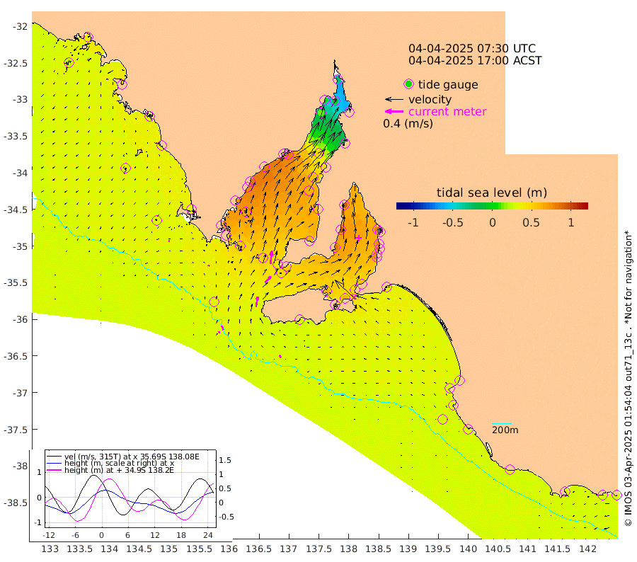 1cm/s 23T +10cm/s rms + 5cm/s 114T. SAM1DS 520m 4cm/s -50T +13cm/s rms + 5cm/s -36T. SAM2CP 100m 10cm/s -20T +21cm/s rms + 18cm/s 142T. SAM3MS 168m 7cm/s -32T +22cm/s rms + 0cm/s -30T. SAM4CY 117m 3cm/s -118T +23cm/s rms + 2cm/s 99T. SAM5CB 94m 18cm/s 42T +8cm/s rms + 3cm/s -172T. SAM6IS 83m 4cm/s -7T +11cm/s rms + 7cm/s 150T. SAM7DS 519m 29cm/s 6T +10cm/s rms + 2cm/s 87T. SAM8SG 47m 23cm/s 9T +20cm/s rms + 12cm/s -168T. NRSKAI 101m 30cm Warrnambool 29cm Port Fairy 30cm Portland 32cm Port Macdonnell 31cm Beachport 31cm Cape Rabelais (off) 31cm Robe 34cm Cape Jaffa 32cm Kingston 38cm Victor Harbor 29cm Vivonne Bay 63cm Kingscote 52cm American River 61cm Penneshaw 51cm Cape Jervis 60cm Second Valley 70cm Port Noarlunga 73cm Port Stanvac 72cm Brighton 76cm Glenelg 78cm Port Adelaide (Outer Harbor) 54cm Angus Inlet (Garden Island) 92cm Ardrossan 90cm Port Vincent 84cm Port Giles 49cm Stenhouse Bay 47cm Althorpe Island 40cm Pondalowie Bay 61cm Point Turton 60cm Port Victoria 62cm Cape Elizabeth 57cm Tiparra Reef Light 43cm Wallaroo 49cm Middle Bank -22cm Port Broughton -21cm Port Pirie -27cm Red Cliff Point (Beacon 5) -5cm Port Bonython 6cm Whyalla 12cm Western Shoal Beacon 56cm Franklin Harbor 81cm Franklin Harbor Entrance Beacon 79cm Arno Bay 86cm Port Neill 77cm Cape Hardy 74cm Tumby Bay 66cm Reevesby Island 66cm Port Lincoln 53cm Taylors Landing 56cm Whalers Bay 49cm Wedge Island Mooring 33cm Shelf Edge Mooring 37cm Coffin Bay Entrance Beacon 31cm Greenly Island 36cm Elliston 28cm Pearson Island 31cm Venus Bay 42cm Blanche Port (Streaky Bay) 39cm Thevenard 25cm St Francis Island