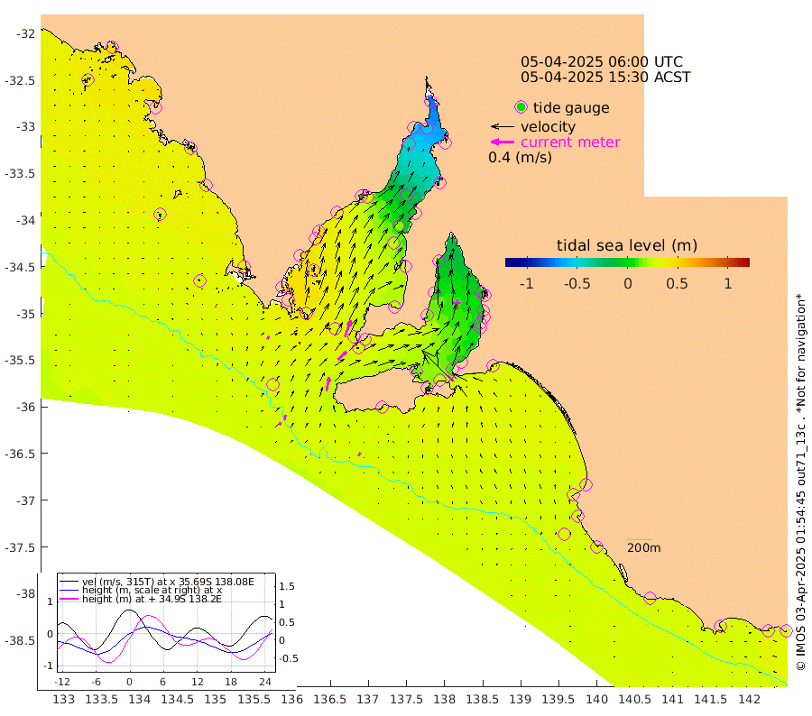 1cm/s 59T +10cm/s rms + 5cm/s 114T. SAM1DS 520m 6cm/s 29T +13cm/s rms + 5cm/s -36T. SAM2CP 100m 9cm/s 8T +21cm/s rms + 18cm/s 142T. SAM3MS 168m 7cm/s 33T +22cm/s rms + 0cm/s -30T. SAM4CY 117m 2cm/s -62T +23cm/s rms + 2cm/s 99T. SAM5CB 94m 21cm/s 45T +8cm/s rms + 3cm/s -172T. SAM6IS 83m 4cm/s 16T +11cm/s rms + 7cm/s 150T. SAM7DS 519m 30cm/s 20T +10cm/s rms + 2cm/s 87T. SAM8SG 47m 25cm/s 12T +20cm/s rms + 12cm/s -168T. NRSKAI 101m 32cm Warrnambool 29cm Port Fairy 29cm Portland 27cm Port Macdonnell 28cm Beachport 28cm Cape Rabelais (off) 28cm Robe 28cm Cape Jaffa 29cm Kingston 31cm Victor Harbor 30cm Vivonne Bay 13cm Kingscote 6cm American River 24cm Penneshaw 10cm Cape Jervis 3cm Second Valley 2cm Port Noarlunga 2cm Port Stanvac -1cm Brighton 0cm Glenelg -3cm Port Adelaide (Outer Harbor) -26cm Angus Inlet (Garden Island) -4cm Ardrossan 5cm Port Vincent 14cm Port Giles 29cm Stenhouse Bay 27cm Althorpe Island 23cm Pondalowie Bay 28cm Point Turton 25cm Port Victoria 23cm Cape Elizabeth 17cm Tiparra Reef Light -3cm Wallaroo -2cm Middle Bank -49cm Port Broughton -67cm Port Pirie -72cm Red Cliff Point (Beacon 5) -54cm Port Bonython -51cm Whyalla -43cm Western Shoal Beacon 5cm Franklin Harbor 35cm Franklin Harbor Entrance Beacon 40cm Arno Bay 50cm Port Neill 44cm Cape Hardy 46cm Tumby Bay 41cm Reevesby Island 47cm Port Lincoln 41cm Taylors Landing 27cm Whalers Bay 32cm Wedge Island Mooring 28cm Shelf Edge Mooring 34cm Coffin Bay Entrance Beacon 30cm Greenly Island 33cm Elliston 28cm Pearson Island 24cm Venus Bay 42cm Blanche Port (Streaky Bay) 42cm Thevenard 34cm St Francis Island