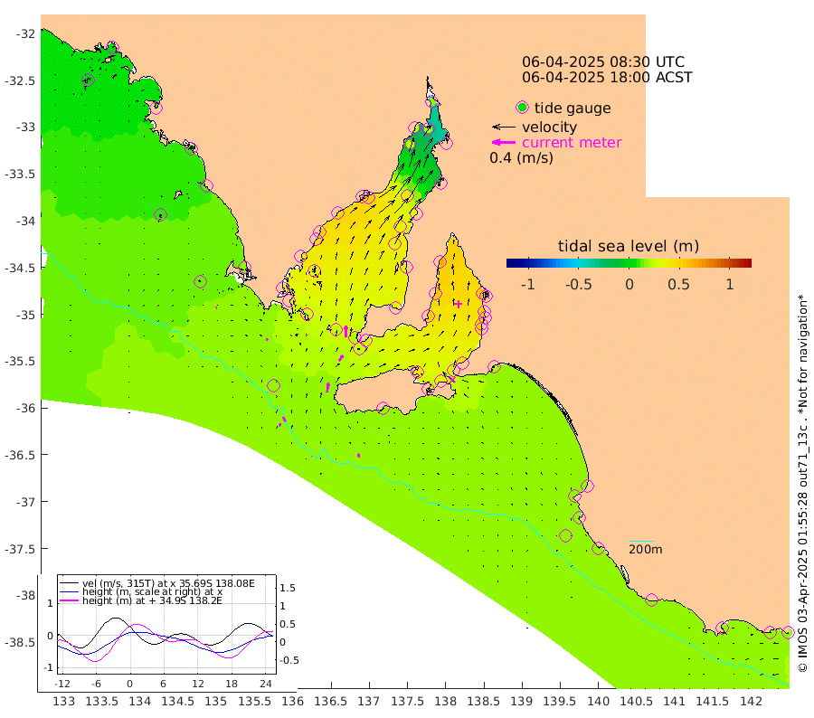 0cm/s 55T +10cm/s rms + 5cm/s 114T. SAM1DS 520m 3cm/s -60T +13cm/s rms + 5cm/s -36T. SAM2CP 100m 9cm/s -26T +21cm/s rms + 18cm/s 142T. SAM3MS 168m 6cm/s -13T +22cm/s rms + 0cm/s -30T. SAM4CY 117m 2cm/s -121T +23cm/s rms + 2cm/s 99T. SAM5CB 94m 12cm/s 37T +8cm/s rms + 3cm/s -172T. SAM6IS 83m 4cm/s -17T +11cm/s rms + 7cm/s 150T. SAM7DS 519m 21cm/s 1T +10cm/s rms + 2cm/s 87T. SAM8SG 47m 16cm/s 7T +20cm/s rms + 12cm/s -168T. NRSKAI 101m 18cm Warrnambool 17cm Port Fairy 18cm Portland 17cm Port Macdonnell 18cm Beachport 17cm Cape Rabelais (off) 16cm Robe 17cm Cape Jaffa 17cm Kingston 21cm Victor Harbor 16cm Vivonne Bay 42cm Kingscote 34cm American River 39cm Penneshaw 34cm Cape Jervis 44cm Second Valley 50cm Port Noarlunga 52cm Port Stanvac 52cm Brighton 54cm Glenelg 57cm Port Adelaide (Outer Harbor) 48cm Angus Inlet (Garden Island) 67cm Ardrossan 59cm Port Vincent 56cm Port Giles 26cm Stenhouse Bay 26cm Althorpe Island 20cm Pondalowie Bay 32cm Point Turton 31cm Port Victoria 37cm Cape Elizabeth 34cm Tiparra Reef Light 31cm Wallaroo 38cm Middle Bank -15cm Port Broughton 11cm Port Pirie 17cm Red Cliff Point (Beacon 5) 22cm Port Bonython 27cm Whyalla 26cm Western Shoal Beacon 39cm Franklin Harbor 51cm Franklin Harbor Entrance Beacon 45cm Arno Bay 50cm Port Neill 42cm Cape Hardy 40cm Tumby Bay 33cm Reevesby Island 33cm Port Lincoln 26cm Taylors Landing 28cm Whalers Bay 25cm Wedge Island Mooring 18cm Shelf Edge Mooring 15cm Coffin Bay Entrance Beacon 14cm Greenly Island 13cm Elliston 9cm Pearson Island 10cm Venus Bay 8cm Blanche Port (Streaky Bay) 7cm Thevenard 3cm St Francis Island