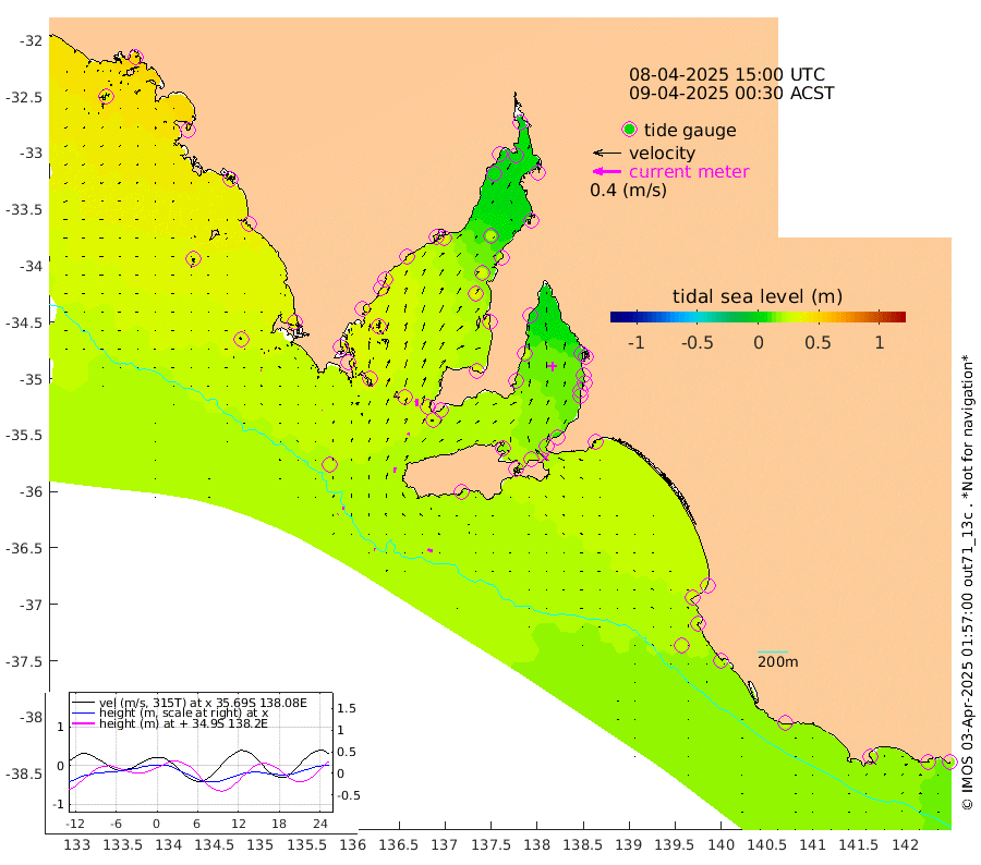 1cm/s -73T +10cm/s rms + 5cm/s 114T. SAM1DS 520m 0cm/s -48T +13cm/s rms + 5cm/s -36T. SAM2CP 100m 2cm/s -90T +21cm/s rms + 18cm/s 142T. SAM3MS 168m 7cm/s -76T +22cm/s rms + 0cm/s -30T. SAM4CY 117m 1cm/s -82T +23cm/s rms + 2cm/s 99T. SAM5CB 94m 3cm/s 18T +8cm/s rms + 3cm/s -172T. SAM6IS 83m 1cm/s -134T +11cm/s rms + 7cm/s 150T. SAM7DS 519m 10cm/s 1T +10cm/s rms + 2cm/s 87T. SAM8SG 47m 7cm/s 10T +20cm/s rms + 12cm/s -168T. NRSKAI 101m 18cm Warrnambool 19cm Port Fairy 20cm Portland 23cm Port Macdonnell 21cm Beachport 23cm Cape Rabelais (off) 23cm Robe 28cm Cape Jaffa 26cm Kingston 26cm Victor Harbor 20cm Vivonne Bay 18cm Kingscote 18cm American River 21cm Penneshaw 16cm Cape Jervis 11cm Second Valley 11cm Port Noarlunga 11cm Port Stanvac 9cm Brighton 11cm Glenelg 8cm Port Adelaide (Outer Harbor) -3cm Angus Inlet (Garden Island) 6cm Ardrossan 25cm Port Vincent 16cm Port Giles 25cm Stenhouse Bay 25cm Althorpe Island 27cm Pondalowie Bay 31cm Point Turton 35cm Port Victoria 35cm Cape Elizabeth 27cm Tiparra Reef Light 22cm Wallaroo 21cm Middle Bank 17cm Port Broughton 0cm Port Pirie -7cm Red Cliff Point (Beacon 5) 1cm Port Bonython 2cm Whyalla 4cm Western Shoal Beacon 23cm Franklin Harbor 32cm Franklin Harbor Entrance Beacon 35cm Arno Bay 37cm Port Neill 37cm Cape Hardy 38cm Tumby Bay 37cm Reevesby Island 36cm Port Lincoln 33cm Taylors Landing 31cm Whalers Bay 31cm Wedge Island Mooring 25cm Shelf Edge Mooring 35cm Coffin Bay Entrance Beacon 28cm Greenly Island 35cm Elliston 33cm Pearson Island 31cm Venus Bay 51cm Blanche Port (Streaky Bay) 49cm Thevenard 33cm St Francis Island