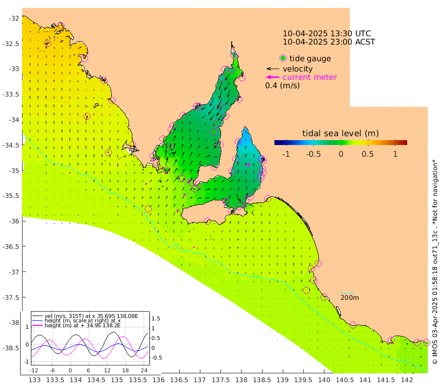 1cm/s -73T +10cm/s rms + 5cm/s 114T. SAM1DS 520m 6cm/s 59T +13cm/s rms + 5cm/s -36T. SAM2CP 100m 2cm/s 81T +21cm/s rms + 18cm/s 142T. SAM3MS 168m 4cm/s -47T +22cm/s rms + 0cm/s -30T. SAM4CY 117m 4cm/s 0T +23cm/s rms + 2cm/s 99T. SAM5CB 94m 8cm/s 50T +8cm/s rms + 3cm/s -172T. SAM6IS 83m 0cm/s 109T +11cm/s rms + 7cm/s 150T. SAM7DS 519m 11cm/s 38T +10cm/s rms + 2cm/s 87T. SAM8SG 47m 9cm/s 15T +20cm/s rms + 12cm/s -168T. NRSKAI 101m 18cm Warrnambool 19cm Port Fairy 21cm Portland 21cm Port Macdonnell 22cm Beachport 24cm Cape Rabelais (off) 23cm Robe 26cm Cape Jaffa 26cm Kingston 23cm Victor Harbor 24cm Vivonne Bay -18cm Kingscote -12cm American River -4cm Penneshaw -14cm Cape Jervis -28cm Second Valley -41cm Port Noarlunga -44cm Port Stanvac -45cm Brighton -46cm Glenelg -55cm Port Adelaide (Outer Harbor) -64cm Angus Inlet (Garden Island) -68cm Ardrossan -36cm Port Vincent -39cm Port Giles 11cm Stenhouse Bay 13cm Althorpe Island 14cm Pondalowie Bay -2cm Point Turton -1cm Port Victoria -2cm Cape Elizabeth -9cm Tiparra Reef Light -17cm Wallaroo -22cm Middle Bank 7cm Port Broughton -24cm Port Pirie -27cm Red Cliff Point (Beacon 5) -30cm Port Bonython -35cm Whyalla -32cm Western Shoal Beacon -23cm Franklin Harbor -14cm Franklin Harbor Entrance Beacon -4cm Arno Bay 3cm Port Neill 8cm Cape Hardy 13cm Tumby Bay 11cm Reevesby Island 17cm Port Lincoln 23cm Taylors Landing 6cm Whalers Bay 18cm Wedge Island Mooring 25cm Shelf Edge Mooring 33cm Coffin Bay Entrance Beacon 28cm Greenly Island 35cm Elliston 38cm Pearson Island 26cm Venus Bay 50cm Blanche Port (Streaky Bay) 48cm Thevenard 48cm St Francis Island