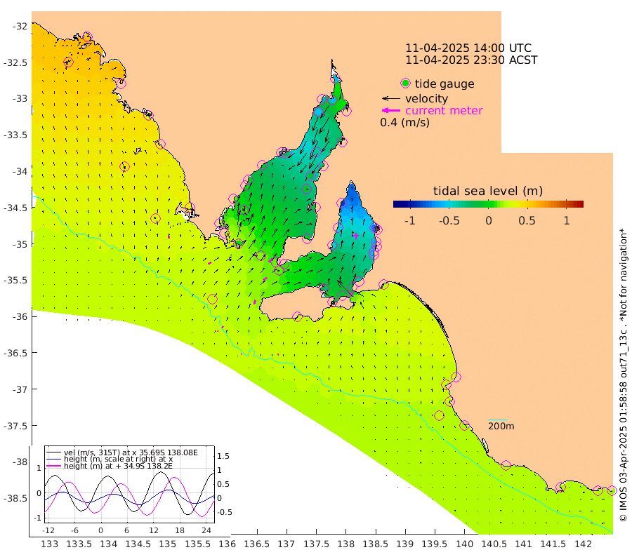 1cm/s -70T +10cm/s rms + 5cm/s 114T. SAM1DS 520m 7cm/s 64T +13cm/s rms + 5cm/s -36T. SAM2CP 100m 4cm/s 99T +21cm/s rms + 18cm/s 142T. SAM3MS 168m 2cm/s -61T +22cm/s rms + 0cm/s -30T. SAM4CY 117m 4cm/s 1T +23cm/s rms + 2cm/s 99T. SAM5CB 94m 10cm/s 58T +8cm/s rms + 3cm/s -172T. SAM6IS 83m 1cm/s 119T +11cm/s rms + 7cm/s 150T. SAM7DS 519m 11cm/s 56T +10cm/s rms + 2cm/s 87T. SAM8SG 47m 9cm/s 19T +20cm/s rms + 12cm/s -168T. NRSKAI 101m 18cm Warrnambool 19cm Port Fairy 20cm Portland 21cm Port Macdonnell 21cm Beachport 24cm Cape Rabelais (off) 23cm Robe 26cm Cape Jaffa 27cm Kingston 22cm Victor Harbor 24cm Vivonne Bay -28cm Kingscote -21cm American River -10cm Penneshaw -22cm Cape Jervis -40cm Second Valley -55cm Port Noarlunga -58cm Port Stanvac -60cm Brighton -61cm Glenelg -72cm Port Adelaide (Outer Harbor) -85cm Angus Inlet (Garden Island) -87cm Ardrossan -52cm Port Vincent -50cm Port Giles 10cm Stenhouse Bay 12cm Althorpe Island 13cm Pondalowie Bay -5cm Point Turton -4cm Port Victoria -8cm Cape Elizabeth -15cm Tiparra Reef Light -28cm Wallaroo -36cm Middle Bank 2cm Port Broughton -50cm Port Pirie -56cm Red Cliff Point (Beacon 5) -57cm Port Bonython -60cm Whyalla -55cm Western Shoal Beacon -35cm Franklin Harbor -22cm Franklin Harbor Entrance Beacon -8cm Arno Bay 1cm Port Neill 6cm Cape Hardy 12cm Tumby Bay 9cm Reevesby Island 17cm Port Lincoln 23cm Taylors Landing 4cm Whalers Bay 16cm Wedge Island Mooring 23cm Shelf Edge Mooring 34cm Coffin Bay Entrance Beacon 29cm Greenly Island 37cm Elliston 40cm Pearson Island 28cm Venus Bay 56cm Blanche Port (Streaky Bay) 54cm Thevenard 55cm St Francis Island