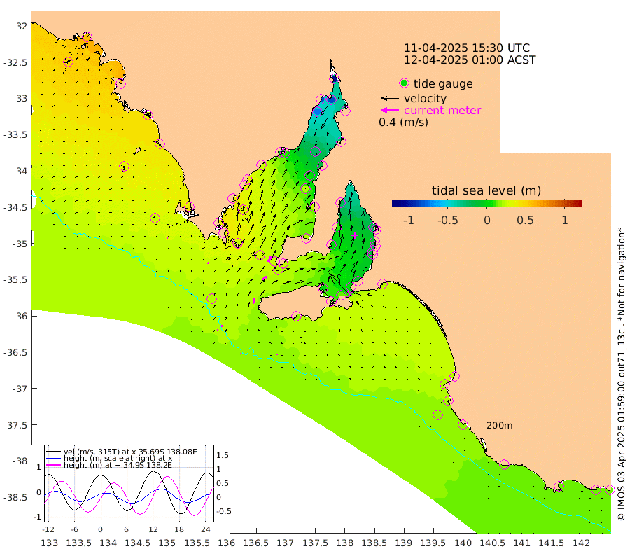 1cm/s -64T +10cm/s rms + 5cm/s 114T. SAM1DS 520m 5cm/s 60T +13cm/s rms + 5cm/s -36T. SAM2CP 100m 4cm/s 69T +21cm/s rms + 18cm/s 142T. SAM3MS 168m 3cm/s -110T +22cm/s rms + 0cm/s -30T. SAM4CY 117m 1cm/s -68T +23cm/s rms + 2cm/s 99T. SAM5CB 94m 12cm/s 55T +8cm/s rms + 3cm/s -172T. SAM6IS 83m 2cm/s 85T +11cm/s rms + 7cm/s 150T. SAM7DS 519m 15cm/s 41T +10cm/s rms + 2cm/s 87T. SAM8SG 47m 13cm/s 17T +20cm/s rms + 12cm/s -168T. NRSKAI 101m 12cm Warrnambool 13cm Port Fairy 14cm Portland 18cm Port Macdonnell 16cm Beachport 19cm Cape Rabelais (off) 19cm Robe 22cm Cape Jaffa 22cm Kingston 21cm Victor Harbor 18cm Vivonne Bay 2cm Kingscote 1cm American River 12cm Penneshaw 0cm Cape Jervis -12cm Second Valley -13cm Port Noarlunga -13cm Port Stanvac -16cm Brighton -14cm Glenelg -20cm Port Adelaide (Outer Harbor) -49cm Angus Inlet (Garden Island) -21cm Ardrossan 9cm Port Vincent 0cm Port Giles 24cm Stenhouse Bay 21cm Althorpe Island 23cm Pondalowie Bay 21cm Point Turton 23cm Port Victoria 19cm Cape Elizabeth 5cm Tiparra Reef Light -17cm Wallaroo -24cm Middle Bank -16cm Port Broughton -92cm Port Pirie -105cm Red Cliff Point (Beacon 5) -84cm Port Bonython -83cm Whyalla -72cm Western Shoal Beacon -12cm Franklin Harbor 11cm Franklin Harbor Entrance Beacon 25cm Arno Bay 35cm Port Neill 36cm Cape Hardy 39cm Tumby Bay 33cm Reevesby Island 38cm Port Lincoln 34cm Taylors Landing 25cm Whalers Bay 27cm Wedge Island Mooring 20cm Shelf Edge Mooring 34cm Coffin Bay Entrance Beacon 25cm Greenly Island 36cm Elliston 36cm Pearson Island 31cm Venus Bay 60cm Blanche Port (Streaky Bay) 57cm Thevenard 46cm St Francis Island