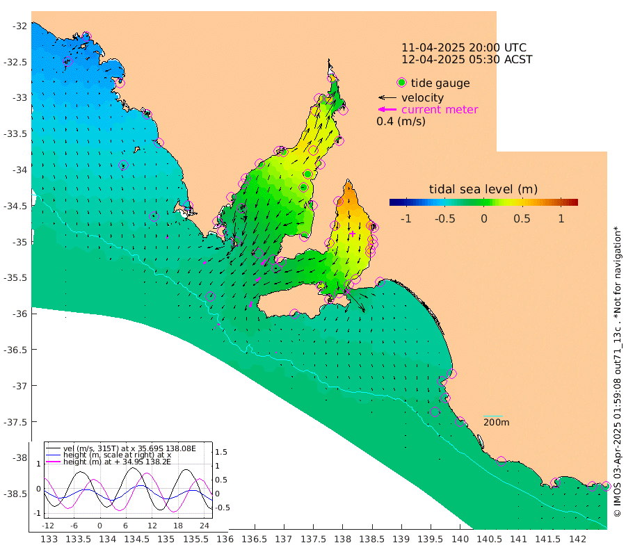 0cm/s -30T +10cm/s rms + 5cm/s 114T. SAM1DS 520m 7cm/s -130T +13cm/s rms + 5cm/s -36T. SAM2CP 100m 4cm/s -103T +21cm/s rms + 18cm/s 142T. SAM3MS 168m 2cm/s 176T +22cm/s rms + 0cm/s -30T. SAM4CY 117m 5cm/s 173T +23cm/s rms + 2cm/s 99T. SAM5CB 94m 12cm/s -127T +8cm/s rms + 3cm/s -172T. SAM6IS 83m 1cm/s -95T +11cm/s rms + 7cm/s 150T. SAM7DS 519m 15cm/s -139T +10cm/s rms + 2cm/s 87T. SAM8SG 47m 13cm/s -164T +20cm/s rms + 12cm/s -168T. NRSKAI 101m -27cm Warrnambool -28cm Port Fairy -29cm Portland -29cm Port Macdonnell -28cm Beachport -30cm Cape Rabelais (off) -30cm Robe -34cm Cape Jaffa -33cm Kingston -31cm Victor Harbor -33cm Vivonne Bay 22cm Kingscote 16cm American River 3cm Penneshaw 16cm Cape Jervis 33cm Second Valley 50cm Port Noarlunga 53cm Port Stanvac 55cm Brighton 58cm Glenelg 67cm Port Adelaide (Outer Harbor) 82cm Angus Inlet (Garden Island) 83cm Ardrossan 51cm Port Vincent 44cm Port Giles -17cm Stenhouse Bay -21cm Althorpe Island -18cm Pondalowie Bay -3cm Point Turton 0cm Port Victoria 3cm Cape Elizabeth 6cm Tiparra Reef Light 19cm Wallaroo 27cm Middle Bank 5cm Port Broughton 41cm Port Pirie 49cm Red Cliff Point (Beacon 5) 54cm Port Bonython 50cm Whyalla 40cm Western Shoal Beacon 25cm Franklin Harbor 10cm Franklin Harbor Entrance Beacon -1cm Arno Bay -8cm Port Neill -14cm Cape Hardy -21cm Tumby Bay -21cm Reevesby Island -28cm Port Lincoln -31cm Taylors Landing -13cm Whalers Bay -23cm Wedge Island Mooring -31cm Shelf Edge Mooring -42cm Coffin Bay Entrance Beacon -37cm Greenly Island -46cm Elliston -44cm Pearson Island -34cm Venus Bay -65cm Blanche Port (Streaky Bay) -64cm Thevenard -66cm St Francis Island