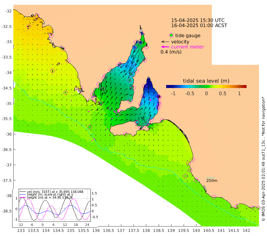 1cm/s -58T +10cm/s rms + 5cm/s 114T. SAM1DS 520m 8cm/s 74T +13cm/s rms + 5cm/s -36T. SAM2CP 100m 8cm/s 126T +21cm/s rms + 18cm/s 142T. SAM3MS 168m 3cm/s -150T +22cm/s rms + 0cm/s -30T. SAM4CY 117m 3cm/s 17T +23cm/s rms + 2cm/s 99T. SAM5CB 94m 9cm/s 79T +8cm/s rms + 3cm/s -172T. SAM6IS 83m 4cm/s 137T +11cm/s rms + 7cm/s 150T. SAM7DS 519m 13cm/s 126T +10cm/s rms + 2cm/s 87T. SAM8SG 47m 3cm/s 64T +20cm/s rms + 12cm/s -168T. NRSKAI 101m 14cm Warrnambool 12cm Port Fairy 13cm Portland 14cm Port Macdonnell 12cm Beachport 14cm Cape Rabelais (off) 16cm Robe 19cm Cape Jaffa 18cm Kingston 10cm Victor Harbor 13cm Vivonne Bay -50cm Kingscote -43cm American River -30cm Penneshaw -42cm Cape Jervis -65cm Second Valley -84cm Port Noarlunga -86cm Port Stanvac -89cm Brighton -90cm Glenelg -104cm Port Adelaide (Outer Harbor) -120cm Angus Inlet (Garden Island) -125cm Ardrossan -92cm Port Vincent -76cm Port Giles 1cm Stenhouse Bay 1cm Althorpe Island 4cm Pondalowie Bay -14cm Point Turton -13cm Port Victoria -23cm Cape Elizabeth -30cm Tiparra Reef Light -46cm Wallaroo -58cm Middle Bank 2cm Port Broughton -80cm Port Pirie -95cm Red Cliff Point (Beacon 5) -97cm Port Bonython -94cm Whyalla -83cm Western Shoal Beacon -49cm Franklin Harbor -40cm Franklin Harbor Entrance Beacon -25cm Arno Bay -19cm Port Neill -13cm Cape Hardy -5cm Tumby Bay -6cm Reevesby Island 6cm Port Lincoln 11cm Taylors Landing -5cm Whalers Bay 5cm Wedge Island Mooring 11cm Shelf Edge Mooring 24cm Coffin Bay Entrance Beacon 19cm Greenly Island 29cm Elliston 26cm Pearson Island 22cm Venus Bay 49cm Blanche Port (Streaky Bay) 48cm Thevenard 43cm St Francis Island