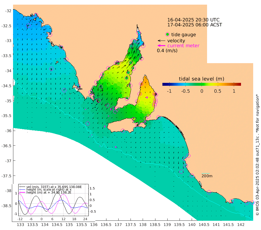 1cm/s 83T +10cm/s rms + 5cm/s 114T. SAM1DS 520m 4cm/s -142T +13cm/s rms + 5cm/s -36T. SAM2CP 100m 2cm/s 60T +21cm/s rms + 18cm/s 142T. SAM3MS 168m 7cm/s 128T +22cm/s rms + 0cm/s -30T. SAM4CY 117m 5cm/s 176T +23cm/s rms + 2cm/s 99T. SAM5CB 94m 4cm/s -165T +8cm/s rms + 3cm/s -172T. SAM6IS 83m 1cm/s 42T +11cm/s rms + 7cm/s 150T. SAM7DS 519m 11cm/s -176T +10cm/s rms + 2cm/s 87T. SAM8SG 47m 9cm/s -170T +20cm/s rms + 12cm/s -168T. NRSKAI 101m -49cm Warrnambool -46cm Port Fairy -46cm Portland -42cm Port Macdonnell -43cm Beachport -45cm Cape Rabelais (off) -44cm Robe -46cm Cape Jaffa -47cm Kingston -41cm Victor Harbor -41cm Vivonne Bay 19cm Kingscote 12cm American River 4cm Penneshaw 12cm Cape Jervis 29cm Second Valley 50cm Port Noarlunga 53cm Port Stanvac 57cm Brighton 58cm Glenelg 68cm Port Adelaide (Outer Harbor) 61cm Angus Inlet (Garden Island) 93cm Ardrossan 68cm Port Vincent 53cm Port Giles -17cm Stenhouse Bay -24cm Althorpe Island -24cm Pondalowie Bay -14cm Point Turton -9cm Port Victoria -8cm Cape Elizabeth -16cm Tiparra Reef Light -18cm Wallaroo -14cm Middle Bank -36cm Port Broughton -55cm Port Pirie -52cm Red Cliff Point (Beacon 5) -40cm Port Bonython -34cm Whyalla -31cm Western Shoal Beacon -2cm Franklin Harbor -3cm Franklin Harbor Entrance Beacon -7cm Arno Bay -11cm Port Neill -12cm Cape Hardy -17cm Tumby Bay -22cm Reevesby Island -25cm Port Lincoln -32cm Taylors Landing -14cm Whalers Bay -30cm Wedge Island Mooring -42cm Shelf Edge Mooring -48cm Coffin Bay Entrance Beacon -43cm Greenly Island -48cm Elliston -45cm Pearson Island -37cm Venus Bay -59cm Blanche Port (Streaky Bay) -59cm Thevenard -53cm St Francis Island