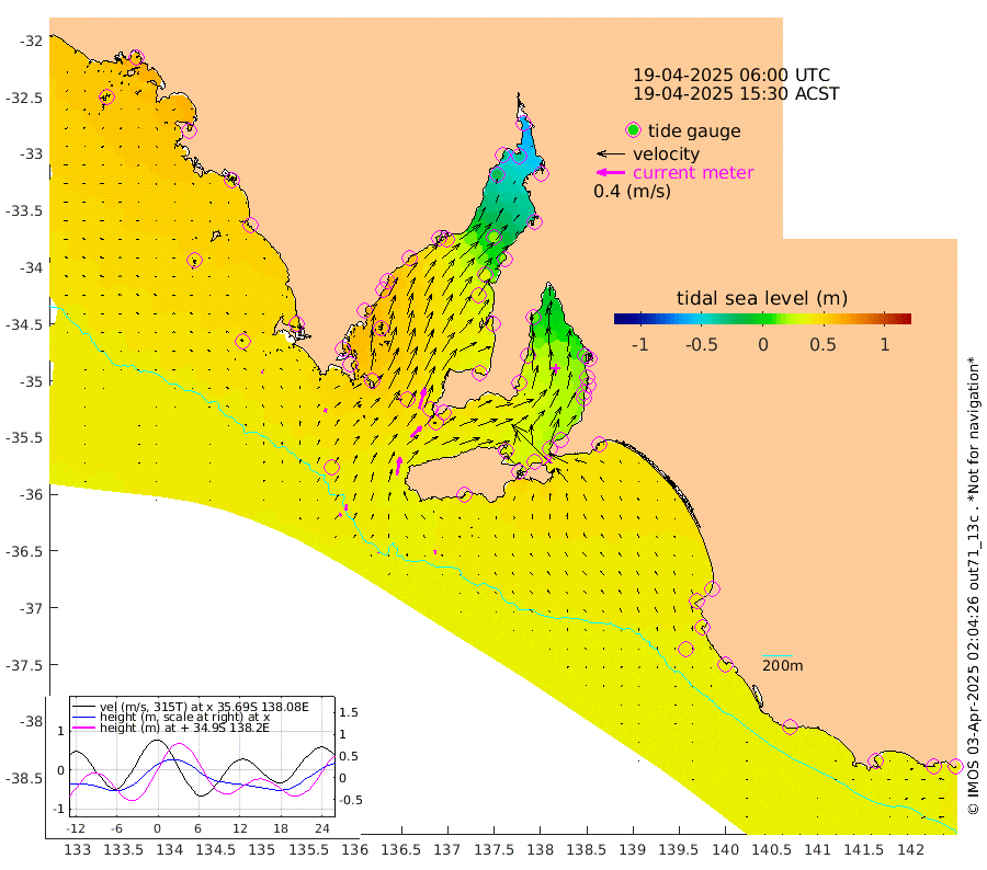 1cm/s 8T +10cm/s rms + 5cm/s 114T. SAM1DS 520m 5cm/s 16T +13cm/s rms + 5cm/s -36T. SAM2CP 100m 8cm/s 5T +21cm/s rms + 18cm/s 142T. SAM3MS 168m 6cm/s -5T +22cm/s rms + 0cm/s -30T. SAM4CY 117m 3cm/s -65T +23cm/s rms + 2cm/s 99T. SAM5CB 94m 22cm/s 45T +8cm/s rms + 3cm/s -172T. SAM6IS 83m 4cm/s 13T +11cm/s rms + 7cm/s 150T. SAM7DS 519m 31cm/s 16T +10cm/s rms + 2cm/s 87T. SAM8SG 47m 26cm/s 11T +20cm/s rms + 12cm/s -168T. NRSKAI 101m 39cm Warrnambool 36cm Port Fairy 37cm Portland 36cm Port Macdonnell 37cm Beachport 39cm Cape Rabelais (off) 38cm Robe 39cm Cape Jaffa 39cm Kingston 42cm Victor Harbor 38cm Vivonne Bay 28cm Kingscote 21cm American River 37cm Penneshaw 23cm Cape Jervis 17cm Second Valley 17cm Port Noarlunga 18cm Port Stanvac 15cm Brighton 18cm Glenelg 12cm Port Adelaide (Outer Harbor) -9cm Angus Inlet (Garden Island) 14cm Ardrossan 20cm Port Vincent 30cm Port Giles 43cm Stenhouse Bay 42cm Althorpe Island 36cm Pondalowie Bay 44cm Point Turton 39cm Port Victoria 35cm Cape Elizabeth 36cm Tiparra Reef Light 16cm Wallaroo 16cm Middle Bank -27cm Port Broughton -47cm Port Pirie -57cm Red Cliff Point (Beacon 5) -35cm Port Bonython -30cm Whyalla -21cm Western Shoal Beacon 16cm Franklin Harbor 50cm Franklin Harbor Entrance Beacon 57cm Arno Bay 69cm Port Neill 62cm Cape Hardy 64cm Tumby Bay 56cm Reevesby Island 62cm Port Lincoln 53cm Taylors Landing 44cm Whalers Bay 46cm Wedge Island Mooring 39cm Shelf Edge Mooring 46cm Coffin Bay Entrance Beacon 40cm Greenly Island 47cm Elliston 42cm Pearson Island 37cm Venus Bay 59cm Blanche Port (Streaky Bay) 58cm Thevenard 48cm St Francis Island