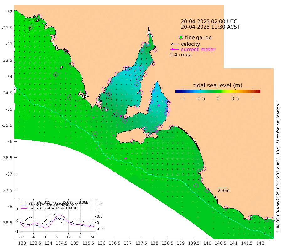 1cm/s 106T +10cm/s rms + 5cm/s 114T. SAM1DS 520m 6cm/s 52T +13cm/s rms + 5cm/s -36T. SAM2CP 100m 4cm/s 46T +21cm/s rms + 18cm/s 142T. SAM3MS 168m 10cm/s 80T +22cm/s rms + 0cm/s -30T. SAM4CY 117m 3cm/s 20T +23cm/s rms + 2cm/s 99T. SAM5CB 94m 3cm/s 14T +8cm/s rms + 3cm/s -172T. SAM6IS 83m 2cm/s 17T +11cm/s rms + 7cm/s 150T. SAM7DS 519m 11cm/s 36T +10cm/s rms + 2cm/s 87T. SAM8SG 47m 5cm/s 15T +20cm/s rms + 12cm/s -168T. NRSKAI 101m -8cm Warrnambool -5cm Port Fairy -6cm Portland -9cm Port Macdonnell -5cm Beachport -6cm Cape Rabelais (off) -7cm Robe -9cm Cape Jaffa -10cm Kingston -7cm Victor Harbor 3cm Vivonne Bay -35cm Kingscote -32cm American River -27cm Penneshaw -27cm Cape Jervis -37cm Second Valley -45cm Port Noarlunga -48cm Port Stanvac -48cm Brighton -53cm Glenelg -53cm Port Adelaide (Outer Harbor) -50cm Angus Inlet (Garden Island) -62cm Ardrossan -58cm Port Vincent -50cm Port Giles -19cm Stenhouse Bay -21cm Althorpe Island -18cm Pondalowie Bay -35cm Point Turton -35cm Port Victoria -36cm Cape Elizabeth -39cm Tiparra Reef Light -41cm Wallaroo -41cm Middle Bank -42cm Port Broughton -34cm Port Pirie -30cm Red Cliff Point (Beacon 5) -38cm Port Bonython -39cm Whyalla -37cm Western Shoal Beacon -46cm Franklin Harbor -39cm Franklin Harbor Entrance Beacon -33cm Arno Bay -38cm Port Neill -26cm Cape Hardy -23cm Tumby Bay -19cm Reevesby Island -18cm Port Lincoln -10cm Taylors Landing -26cm Whalers Bay -16cm Wedge Island Mooring -3cm Shelf Edge Mooring -5cm Coffin Bay Entrance Beacon 2cm Greenly Island -2cm Elliston 2cm Pearson Island -10cm Venus Bay -3cm Blanche Port (Streaky Bay) 1cm Thevenard 9cm St Francis Island