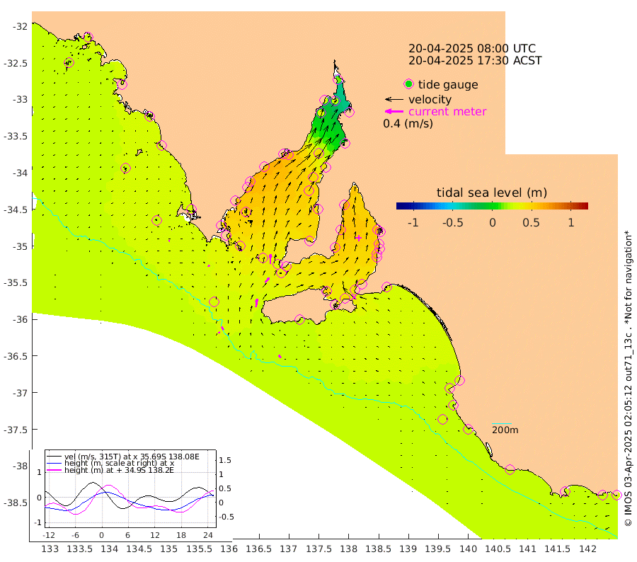 0cm/s -28T +10cm/s rms + 5cm/s 114T. SAM1DS 520m 4cm/s -67T +13cm/s rms + 5cm/s -36T. SAM2CP 100m 8cm/s -25T +21cm/s rms + 18cm/s 142T. SAM3MS 168m 7cm/s -37T +22cm/s rms + 0cm/s -30T. SAM4CY 117m 2cm/s -108T +23cm/s rms + 2cm/s 99T. SAM5CB 94m 13cm/s 39T +8cm/s rms + 3cm/s -172T. SAM6IS 83m 4cm/s -14T +11cm/s rms + 7cm/s 150T. SAM7DS 519m 22cm/s 0T +10cm/s rms + 2cm/s 87T. SAM8SG 47m 17cm/s 8T +20cm/s rms + 12cm/s -168T. NRSKAI 101m 26cm Warrnambool 24cm Port Fairy 26cm Portland 26cm Port Macdonnell 26cm Beachport 27cm Cape Rabelais (off) 25cm Robe 27cm Cape Jaffa 27cm Kingston 31cm Victor Harbor 24cm Vivonne Bay 50cm Kingscote 42cm American River 48cm Penneshaw 42cm Cape Jervis 51cm Second Valley 56cm Port Noarlunga 58cm Port Stanvac 59cm Brighton 62cm Glenelg 62cm Port Adelaide (Outer Harbor) 51cm Angus Inlet (Garden Island) 73cm Ardrossan 64cm Port Vincent 64cm Port Giles 38cm Stenhouse Bay 40cm Althorpe Island 31cm Pondalowie Bay 46cm Point Turton 44cm Port Victoria 45cm Cape Elizabeth 49cm Tiparra Reef Light 42cm Wallaroo 47cm Middle Bank -1cm Port Broughton 13cm Port Pirie 13cm Red Cliff Point (Beacon 5) 24cm Port Bonython 30cm Whyalla 32cm Western Shoal Beacon 43cm Franklin Harbor 62cm Franklin Harbor Entrance Beacon 60cm Arno Bay 68cm Port Neill 59cm Cape Hardy 56cm Tumby Bay 47cm Reevesby Island 48cm Port Lincoln 39cm Taylors Landing 43cm Whalers Bay 38cm Wedge Island Mooring 27cm Shelf Edge Mooring 29cm Coffin Bay Entrance Beacon 24cm Greenly Island 29cm Elliston 24cm Pearson Island 23cm Venus Bay 29cm Blanche Port (Streaky Bay) 27cm Thevenard 22cm St Francis Island