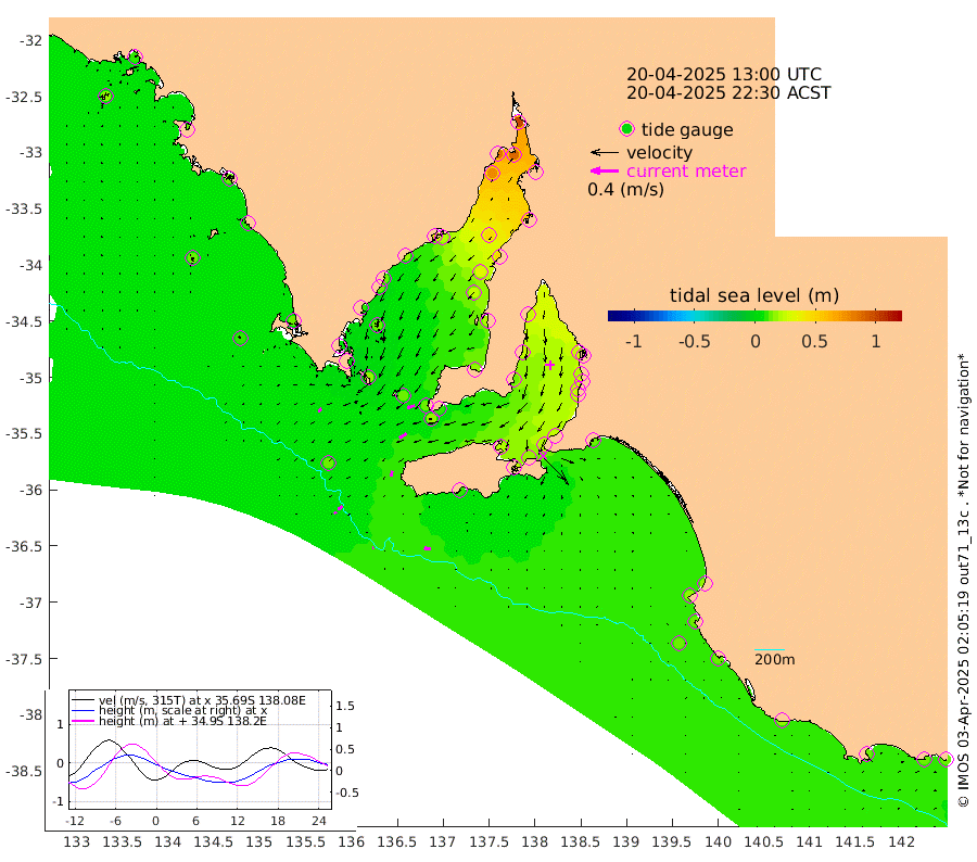 1cm/s -100T +10cm/s rms + 5cm/s 114T. SAM1DS 520m 6cm/s -130T +13cm/s rms + 5cm/s -36T. SAM2CP 100m 7cm/s -125T +21cm/s rms + 18cm/s 142T. SAM3MS 168m 9cm/s -82T +22cm/s rms + 0cm/s -30T. SAM4CY 117m 0cm/s -117T +23cm/s rms + 2cm/s 99T. SAM5CB 94m 12cm/s -123T +8cm/s rms + 3cm/s -172T. SAM6IS 83m 3cm/s -131T +11cm/s rms + 7cm/s 150T. SAM7DS 519m 12cm/s -109T +10cm/s rms + 2cm/s 87T. SAM8SG 47m 8cm/s -160T +20cm/s rms + 12cm/s -168T. NRSKAI 101m 13cm Warrnambool 14cm Port Fairy 14cm Portland 15cm Port Macdonnell 13cm Beachport 14cm Cape Rabelais (off) 13cm Robe 16cm Cape Jaffa 15cm Kingston 14cm Victor Harbor 8cm Vivonne Bay 19cm Kingscote 25cm American River 16cm Penneshaw 20cm Cape Jervis 23cm Second Valley 23cm Port Noarlunga 23cm Port Stanvac 23cm Brighton 22cm Glenelg 24cm Port Adelaide (Outer Harbor) 37cm Angus Inlet (Garden Island) 23cm Ardrossan 26cm Port Vincent 15cm Port Giles 8cm Stenhouse Bay 15cm Althorpe Island 13cm Pondalowie Bay 18cm Point Turton 21cm Port Victoria 26cm Cape Elizabeth 31cm Tiparra Reef Light 47cm Wallaroo 48cm Middle Bank 58cm Port Broughton 95cm Port Pirie 101cm Red Cliff Point (Beacon 5) 89cm Port Bonython 84cm Whyalla 76cm Western Shoal Beacon 36cm Franklin Harbor 21cm Franklin Harbor Entrance Beacon 15cm Arno Bay 13cm Port Neill 14cm Cape Hardy 11cm Tumby Bay 14cm Reevesby Island 7cm Port Lincoln 7cm Taylors Landing 15cm Whalers Bay 13cm Wedge Island Mooring 12cm Shelf Edge Mooring 13cm Coffin Bay Entrance Beacon 10cm Greenly Island 10cm Elliston 14cm Pearson Island 13cm Venus Bay 13cm Blanche Port (Streaky Bay) 10cm Thevenard 16cm St Francis Island