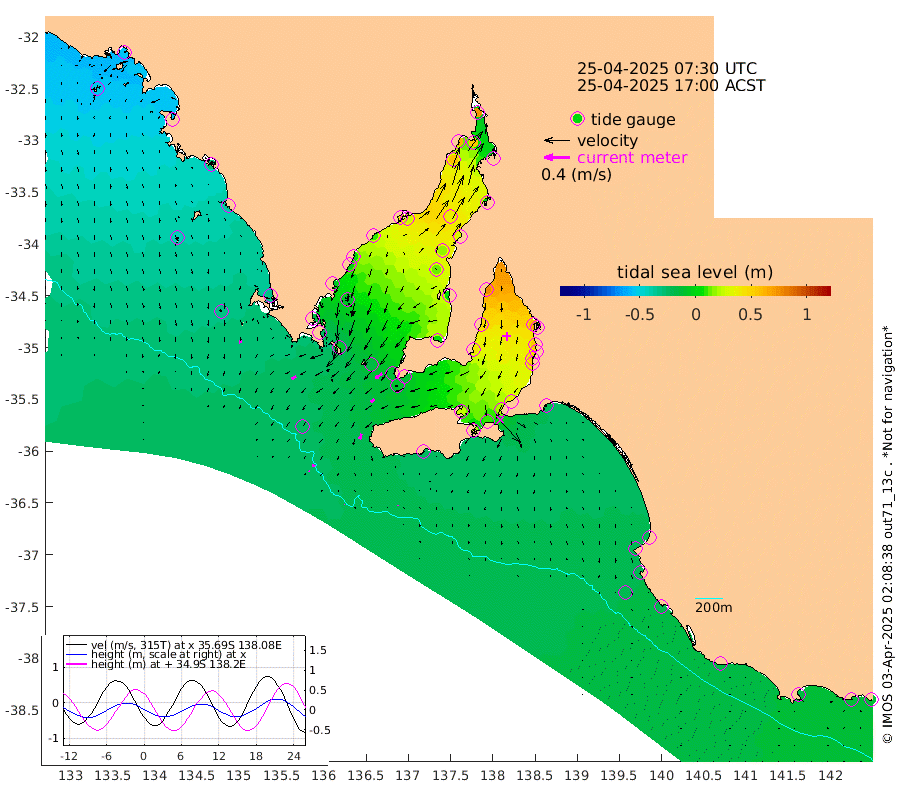 0cm/s 150T +10cm/s rms + 5cm/s 114T. SAM1DS 520m 8cm/s -122T +13cm/s rms + 5cm/s -36T. SAM2CP 100m 5cm/s -76T +21cm/s rms + 18cm/s 142T. SAM3MS 168m 1cm/s 31T +22cm/s rms + 0cm/s -30T. SAM4CY 117m 5cm/s 177T +23cm/s rms + 2cm/s 99T. SAM5CB 94m 7cm/s -124T +8cm/s rms + 3cm/s -172T. SAM6IS 83m 2cm/s -66T +11cm/s rms + 7cm/s 150T. SAM7DS 519m 13cm/s -127T +10cm/s rms + 2cm/s 87T. SAM8SG 47m 9cm/s -158T +20cm/s rms + 12cm/s -168T. NRSKAI 101m -13cm Warrnambool -15cm Port Fairy -17cm Portland -19cm Port Macdonnell -20cm Beachport -22cm Cape Rabelais (off) -21cm Robe -22cm Cape Jaffa -20cm Kingston -19cm Victor Harbor -25cm Vivonne Bay 24cm Kingscote 19cm American River 11cm Penneshaw 19cm Cape Jervis 38cm Second Valley 49cm Port Noarlunga 51cm Port Stanvac 52cm Brighton 53cm Glenelg 63cm Port Adelaide (Outer Harbor) 71cm Angus Inlet (Garden Island) 76cm Ardrossan 46cm Port Vincent 44cm Port Giles -12cm Stenhouse Bay -10cm Althorpe Island -15cm Pondalowie Bay 5cm Point Turton 3cm Port Victoria 12cm Cape Elizabeth 18cm Tiparra Reef Light 30cm Wallaroo 37cm Middle Bank 4cm Port Broughton 53cm Port Pirie 72cm Red Cliff Point (Beacon 5) 53cm Port Bonython 62cm Whyalla 59cm Western Shoal Beacon 39cm Franklin Harbor 24cm Franklin Harbor Entrance Beacon 8cm Arno Bay 4cm Port Neill -2cm Cape Hardy -8cm Tumby Bay -10cm Reevesby Island -18cm Port Lincoln -24cm Taylors Landing -5cm Whalers Bay -17cm Wedge Island Mooring -25cm Shelf Edge Mooring -33cm Coffin Bay Entrance Beacon -30cm Greenly Island -37cm Elliston -44cm Pearson Island -27cm Venus Bay -55cm Blanche Port (Streaky Bay) -55cm Thevenard -50cm St Francis Island