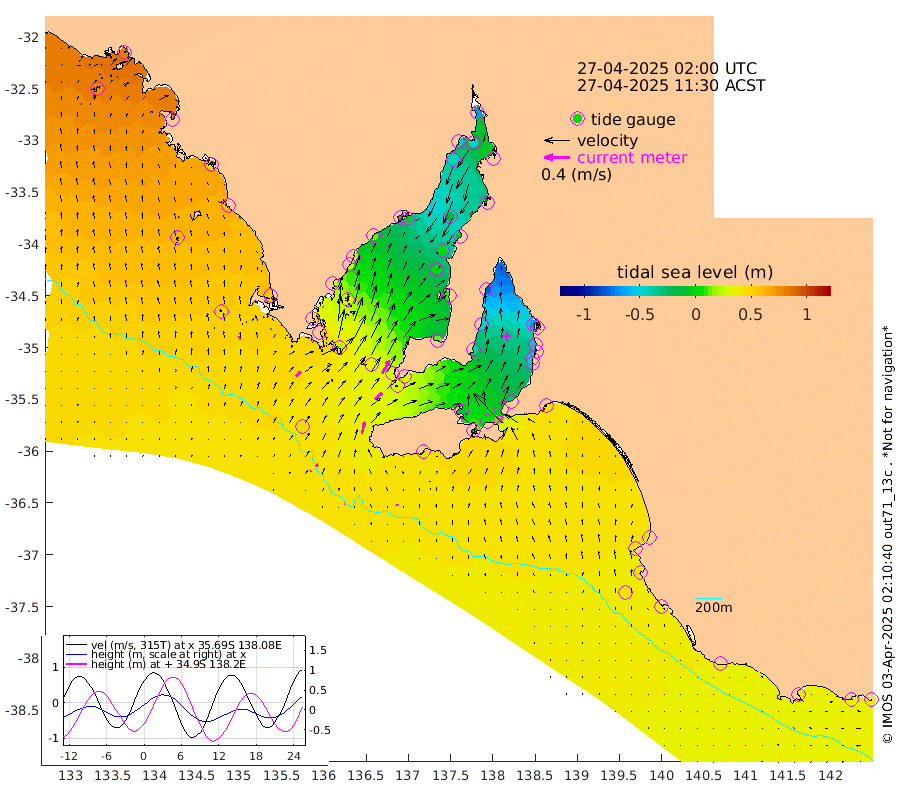 0cm/s 61T +10cm/s rms + 5cm/s 114T. SAM1DS 520m 10cm/s 45T +13cm/s rms + 5cm/s -36T. SAM2CP 100m 5cm/s 59T +21cm/s rms + 18cm/s 142T. SAM3MS 168m 2cm/s 10T +22cm/s rms + 0cm/s -30T. SAM4CY 117m 6cm/s -13T +23cm/s rms + 2cm/s 99T. SAM5CB 94m 15cm/s 50T +8cm/s rms + 3cm/s -172T. SAM6IS 83m 2cm/s 48T +11cm/s rms + 7cm/s 150T. SAM7DS 519m 23cm/s 30T +10cm/s rms + 2cm/s 87T. SAM8SG 47m 19cm/s 15T +20cm/s rms + 12cm/s -168T. NRSKAI 101m 38cm Warrnambool 38cm Port Fairy 40cm Portland 40cm Port Macdonnell 41cm Beachport 43cm Cape Rabelais (off) 42cm Robe 43cm Cape Jaffa 42cm Kingston 42cm Victor Harbor 47cm Vivonne Bay -14cm Kingscote -11cm American River 3cm Penneshaw -11cm Cape Jervis -31cm Second Valley -46cm Port Noarlunga -49cm Port Stanvac -53cm Brighton -55cm Glenelg -65cm Port Adelaide (Outer Harbor) -78cm Angus Inlet (Garden Island) -81cm Ardrossan -47cm Port Vincent -39cm Port Giles 29cm Stenhouse Bay 28cm Althorpe Island 30cm Pondalowie Bay 14cm Point Turton 9cm Port Victoria 2cm Cape Elizabeth 2cm Tiparra Reef Light -15cm Wallaroo -22cm Middle Bank -11cm Port Broughton -44cm Port Pirie -66cm Red Cliff Point (Beacon 5) -45cm Port Bonython -50cm Whyalla -44cm Western Shoal Beacon -26cm Franklin Harbor -3cm Franklin Harbor Entrance Beacon 13cm Arno Bay 21cm Port Neill 25cm Cape Hardy 32cm Tumby Bay 36cm Reevesby Island 43cm Port Lincoln 47cm Taylors Landing 21cm Whalers Bay 37cm Wedge Island Mooring 45cm Shelf Edge Mooring 56cm Coffin Bay Entrance Beacon 50cm Greenly Island 59cm Elliston 61cm Pearson Island 44cm Venus Bay 80cm Blanche Port (Streaky Bay) 80cm Thevenard 75cm St Francis Island