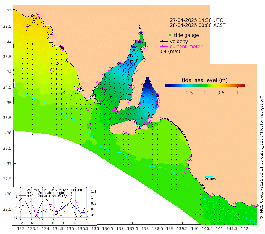 1cm/s -60T +10cm/s rms + 5cm/s 114T. SAM1DS 520m 9cm/s 68T +13cm/s rms + 5cm/s -36T. SAM2CP 100m 7cm/s 115T +21cm/s rms + 18cm/s 142T. SAM3MS 168m 2cm/s 156T +22cm/s rms + 0cm/s -30T. SAM4CY 117m 4cm/s 13T +23cm/s rms + 2cm/s 99T. SAM5CB 94m 11cm/s 66T +8cm/s rms + 3cm/s -172T. SAM6IS 83m 3cm/s 127T +11cm/s rms + 7cm/s 150T. SAM7DS 519m 13cm/s 108T +10cm/s rms + 2cm/s 87T. SAM8SG 47m 5cm/s 37T +20cm/s rms + 12cm/s -168T. NRSKAI 101m 3cm Warrnambool 4cm Port Fairy 5cm Portland 7cm Port Macdonnell 7cm Beachport 8cm Cape Rabelais (off) 9cm Robe 12cm Cape Jaffa 13cm Kingston 6cm Victor Harbor 10cm Vivonne Bay -50cm Kingscote -44cm American River -32cm Penneshaw -44cm Cape Jervis -64cm Second Valley -82cm Port Noarlunga -84cm Port Stanvac -87cm Brighton -87cm Glenelg -100cm Port Adelaide (Outer Harbor) -117cm Angus Inlet (Garden Island) -120cm Ardrossan -80cm Port Vincent -74cm Port Giles -4cm Stenhouse Bay -6cm Althorpe Island 0cm Pondalowie Bay -22cm Point Turton -20cm Port Victoria -26cm Cape Elizabeth -40cm Tiparra Reef Light -57cm Wallaroo -68cm Middle Bank -10cm Port Broughton -92cm Port Pirie -103cm Red Cliff Point (Beacon 5) -102cm Port Bonython -104cm Whyalla -95cm Western Shoal Beacon -56cm Franklin Harbor -46cm Franklin Harbor Entrance Beacon -30cm Arno Bay -24cm Port Neill -17cm Cape Hardy -9cm Tumby Bay -11cm Reevesby Island 1cm Port Lincoln 8cm Taylors Landing -13cm Whalers Bay 1cm Wedge Island Mooring 9cm Shelf Edge Mooring 21cm Coffin Bay Entrance Beacon 16cm Greenly Island 25cm Elliston 24cm Pearson Island 17cm Venus Bay 44cm Blanche Port (Streaky Bay) 44cm Thevenard 31cm St Francis Island