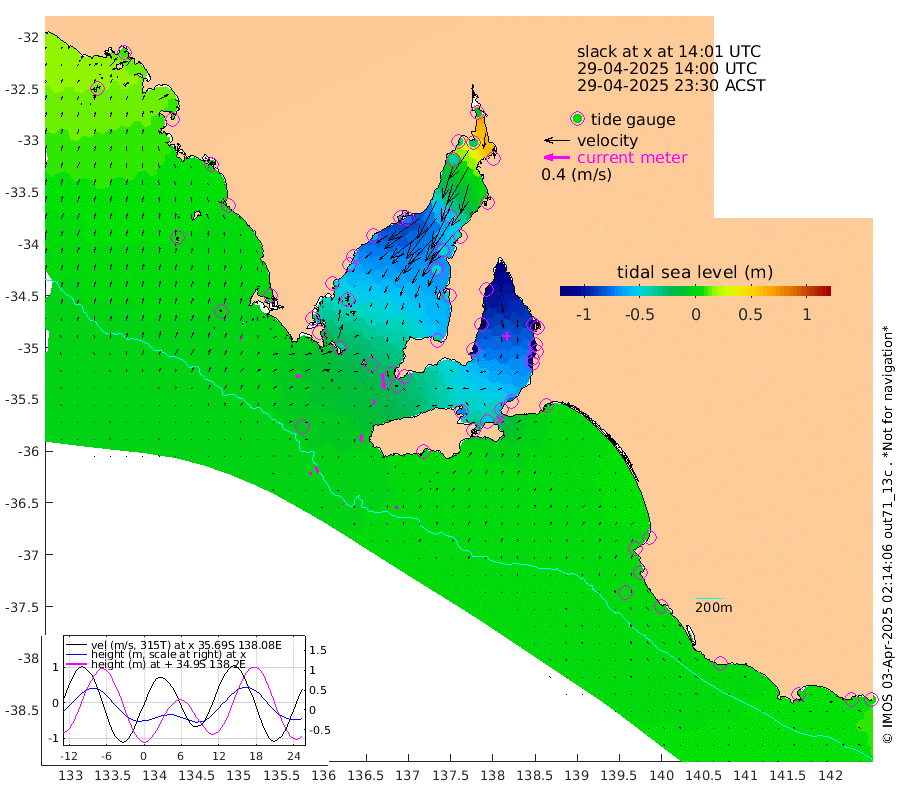 1cm/s -81T +10cm/s rms + 5cm/s 114T. SAM1DS 520m 6cm/s 90T +13cm/s rms + 5cm/s -36T. SAM2CP 100m 10cm/s 157T +21cm/s rms + 18cm/s 142T. SAM3MS 168m 4cm/s -156T +22cm/s rms + 0cm/s -30T. SAM4CY 117m 4cm/s 32T +23cm/s rms + 2cm/s 99T. SAM5CB 94m 7cm/s -162T +8cm/s rms + 3cm/s -172T. SAM6IS 83m 5cm/s 164T +11cm/s rms + 7cm/s 150T. SAM7DS 519m 23cm/s 172T +10cm/s rms + 2cm/s 87T. SAM8SG 47m 12cm/s -176T +20cm/s rms + 12cm/s -168T. NRSKAI 101m 5cm Warrnambool 4cm Port Fairy 4cm Portland 2cm Port Macdonnell 1cm Beachport 2cm Cape Rabelais (off) 3cm Robe 3cm Cape Jaffa 5cm Kingston -7cm Victor Harbor -1cm Vivonne Bay -70cm Kingscote -57cm American River -54cm Penneshaw -58cm Cape Jervis -78cm Second Valley -102cm Port Noarlunga -106cm Port Stanvac -109cm Brighton -112cm Glenelg -123cm Port Adelaide (Outer Harbor) -116cm Angus Inlet (Garden Island) -150cm Ardrossan -122cm Port Vincent -106cm Port Giles -26cm Stenhouse Bay -22cm Althorpe Island -16cm Pondalowie Bay -40cm Point Turton -42cm Port Victoria -46cm Cape Elizabeth -45cm Tiparra Reef Light -44cm Wallaroo -55cm Middle Bank 33cm Port Broughton -8cm Port Pirie -12cm Red Cliff Point (Beacon 5) -33cm Port Bonython -39cm Whyalla -40cm Western Shoal Beacon -56cm Franklin Harbor -72cm Franklin Harbor Entrance Beacon -63cm Arno Bay -61cm Port Neill -52cm Cape Hardy -46cm Tumby Bay -42cm Reevesby Island -34cm Port Lincoln -20cm Taylors Landing -35cm Whalers Bay -21cm Wedge Island Mooring -4cm Shelf Edge Mooring 0cm Coffin Bay Entrance Beacon -1cm Greenly Island 2cm Elliston 4cm Pearson Island 1cm Venus Bay 10cm Blanche Port (Streaky Bay) 9cm Thevenard 15cm St Francis Island