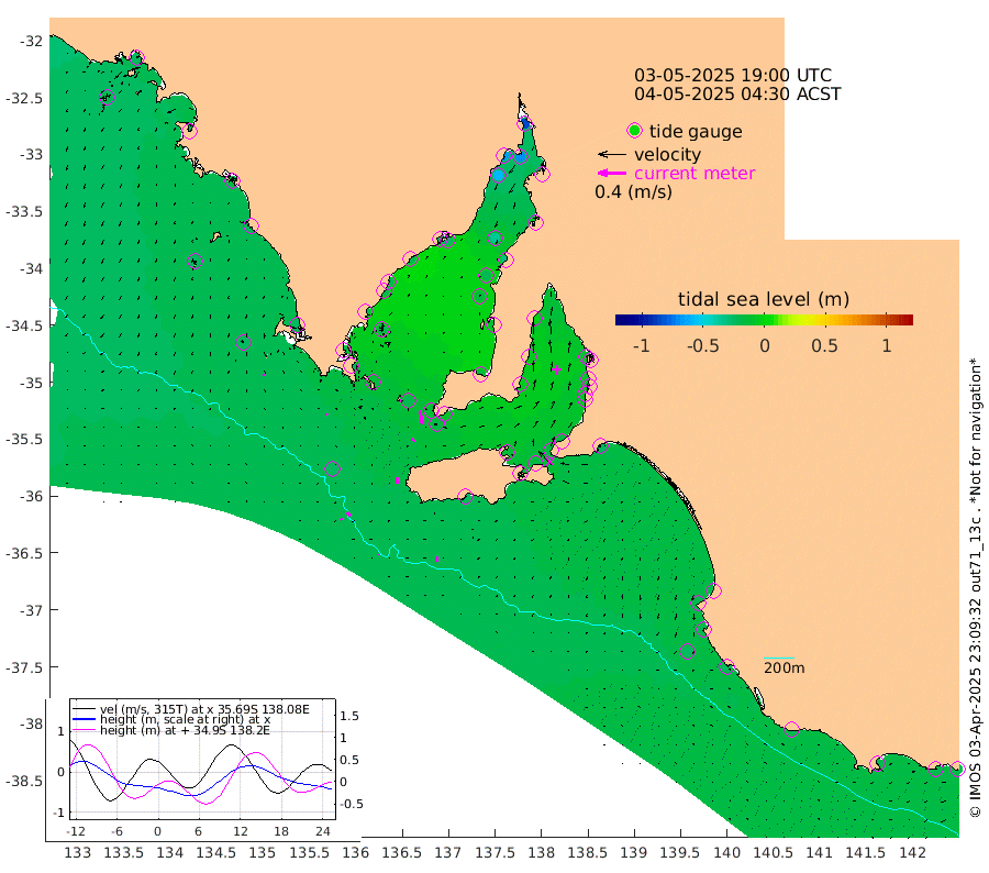 0cm/s -24T +10cm/s rms + 5cm/s 114T. SAM1DS 520m 3cm/s 129T +13cm/s rms + 5cm/s -36T. SAM2CP 100m 7cm/s 128T +21cm/s rms + 18cm/s 142T. SAM3MS 168m 8cm/s 171T +22cm/s rms + 0cm/s -30T. SAM4CY 117m 2cm/s 168T +23cm/s rms + 2cm/s 99T. SAM5CB 94m 5cm/s 124T +8cm/s rms + 3cm/s -172T. SAM6IS 83m 3cm/s 126T +11cm/s rms + 7cm/s 150T. SAM7DS 519m 20cm/s 169T +10cm/s rms + 2cm/s 87T. SAM8SG 47m 9cm/s -179T +20cm/s rms + 12cm/s -168T. NRSKAI 101m -22cm Warrnambool -22cm Port Fairy -22cm Portland -20cm Port Macdonnell -23cm Beachport -23cm Cape Rabelais (off) -20cm Robe -22cm Cape Jaffa -22cm Kingston -25cm Victor Harbor -24cm Vivonne Bay -13cm Kingscote -16cm American River -15cm Penneshaw -16cm Cape Jervis -17cm Second Valley -11cm Port Noarlunga -10cm Port Stanvac -10cm Brighton -9cm Glenelg -9cm Port Adelaide (Outer Harbor) -20cm Angus Inlet (Garden Island) -3cm Ardrossan -5cm Port Vincent -4cm Port Giles -11cm Stenhouse Bay -17cm Althorpe Island -14cm Pondalowie Bay -13cm Point Turton -13cm Port Victoria -18cm Cape Elizabeth -21cm Tiparra Reef Light -32cm Wallaroo -37cm Middle Bank -11cm Port Broughton -70cm Port Pirie -84cm Red Cliff Point (Beacon 5) -68cm Port Bonython -65cm Whyalla -60cm Western Shoal Beacon -23cm Franklin Harbor -26cm Franklin Harbor Entrance Beacon -21cm Arno Bay -19cm Port Neill -20cm Cape Hardy -20cm Tumby Bay -21cm Reevesby Island -18cm Port Lincoln -20cm Taylors Landing -13cm Whalers Bay -19cm Wedge Island Mooring -25cm Shelf Edge Mooring -25cm Coffin Bay Entrance Beacon -24cm Greenly Island -24cm Elliston -23cm Pearson Island -15cm Venus Bay -23cm Blanche Port (Streaky Bay) -24cm Thevenard -22cm St Francis Island