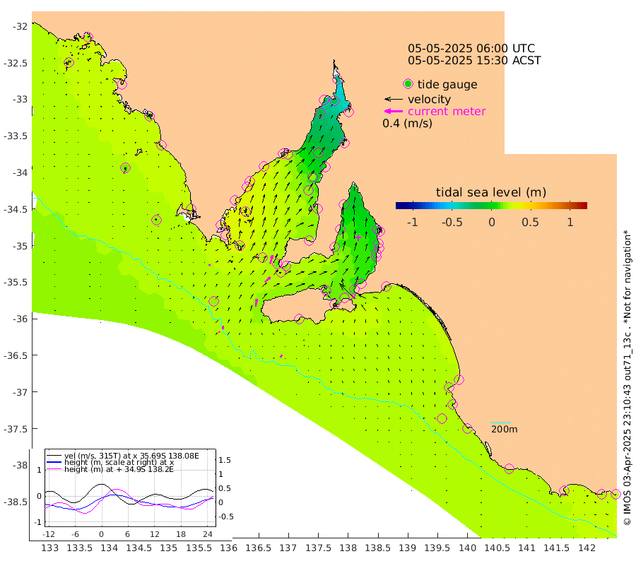 0cm/s 42T +10cm/s rms + 5cm/s 114T. SAM1DS 520m 3cm/s 16T +13cm/s rms + 5cm/s -36T. SAM2CP 100m 7cm/s 4T +21cm/s rms + 18cm/s 142T. SAM3MS 168m 5cm/s 22T +22cm/s rms + 0cm/s -30T. SAM4CY 117m 1cm/s -83T +23cm/s rms + 2cm/s 99T. SAM5CB 94m 16cm/s 48T +8cm/s rms + 3cm/s -172T. SAM6IS 83m 3cm/s 11T +11cm/s rms + 7cm/s 150T. SAM7DS 519m 19cm/s 16T +10cm/s rms + 2cm/s 87T. SAM8SG 47m 17cm/s 10T +20cm/s rms + 12cm/s -168T. NRSKAI 101m 25cm Warrnambool 21cm Port Fairy 21cm Portland 17cm Port Macdonnell 19cm Beachport 19cm Cape Rabelais (off) 18cm Robe 18cm Cape Jaffa 21cm Kingston 21cm Victor Harbor 19cm Vivonne Bay 12cm Kingscote 6cm American River 17cm Penneshaw 9cm Cape Jervis 6cm Second Valley 5cm Port Noarlunga 5cm Port Stanvac 3cm Brighton 5cm Glenelg 2cm Port Adelaide (Outer Harbor) -11cm Angus Inlet (Garden Island) 1cm Ardrossan 2cm Port Vincent 12cm Port Giles 18cm Stenhouse Bay 20cm Althorpe Island 14cm Pondalowie Bay 20cm Point Turton 15cm Port Victoria 16cm Cape Elizabeth 16cm Tiparra Reef Light 5cm Wallaroo 6cm Middle Bank -28cm Port Broughton -30cm Port Pirie -26cm Red Cliff Point (Beacon 5) -22cm Port Bonython -19cm Whyalla -13cm Western Shoal Beacon 8cm Franklin Harbor 28cm Franklin Harbor Entrance Beacon 28cm Arno Bay 38cm Port Neill 32cm Cape Hardy 32cm Tumby Bay 26cm Reevesby Island 29cm Port Lincoln 25cm Taylors Landing 18cm Whalers Bay 20cm Wedge Island Mooring 17cm Shelf Edge Mooring 20cm Coffin Bay Entrance Beacon 17cm Greenly Island 19cm Elliston 14cm Pearson Island 14cm Venus Bay 22cm Blanche Port (Streaky Bay) 22cm Thevenard 19cm St Francis Island