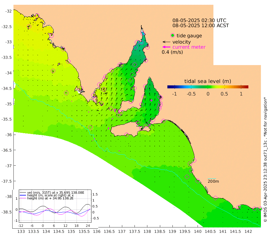 1cm/s 120T +10cm/s rms + 5cm/s 114T. SAM1DS 520m 4cm/s 18T +13cm/s rms + 5cm/s -36T. SAM2CP 100m 4cm/s 38T +21cm/s rms + 18cm/s 142T. SAM3MS 168m 3cm/s 83T +22cm/s rms + 0cm/s -30T. SAM4CY 117m 2cm/s -51T +23cm/s rms + 2cm/s 99T. SAM5CB 94m 5cm/s 37T +8cm/s rms + 3cm/s -172T. SAM6IS 83m 2cm/s 37T +11cm/s rms + 7cm/s 150T. SAM7DS 519m 15cm/s 22T +10cm/s rms + 2cm/s 87T. SAM8SG 47m 10cm/s 14T +20cm/s rms + 12cm/s -168T. NRSKAI 101m 6cm Warrnambool 7cm Port Fairy 8cm Portland 9cm Port Macdonnell 10cm Beachport 10cm Cape Rabelais (off) 11cm Robe 12cm Cape Jaffa 9cm Kingston 14cm Victor Harbor 15cm Vivonne Bay 8cm Kingscote 7cm American River 11cm Penneshaw 7cm Cape Jervis 2cm Second Valley 4cm Port Noarlunga 4cm Port Stanvac 3cm Brighton 1cm Glenelg 1cm Port Adelaide (Outer Harbor) -14cm Angus Inlet (Garden Island) 3cm Ardrossan 14cm Port Vincent 10cm Port Giles 16cm Stenhouse Bay 14cm Althorpe Island 13cm Pondalowie Bay 14cm Point Turton 12cm Port Victoria 10cm Cape Elizabeth 7cm Tiparra Reef Light -5cm Wallaroo -7cm Middle Bank -26cm Port Broughton -46cm Port Pirie -55cm Red Cliff Point (Beacon 5) -45cm Port Bonython -37cm Whyalla -26cm Western Shoal Beacon -2cm Franklin Harbor 14cm Franklin Harbor Entrance Beacon 20cm Arno Bay 20cm Port Neill 25cm Cape Hardy 26cm Tumby Bay 29cm Reevesby Island 27cm Port Lincoln 23cm Taylors Landing 17cm Whalers Bay 17cm Wedge Island Mooring 14cm Shelf Edge Mooring 22cm Coffin Bay Entrance Beacon 18cm Greenly Island 24cm Elliston 21cm Pearson Island 19cm Venus Bay 37cm Blanche Port (Streaky Bay) 37cm Thevenard 32cm St Francis Island