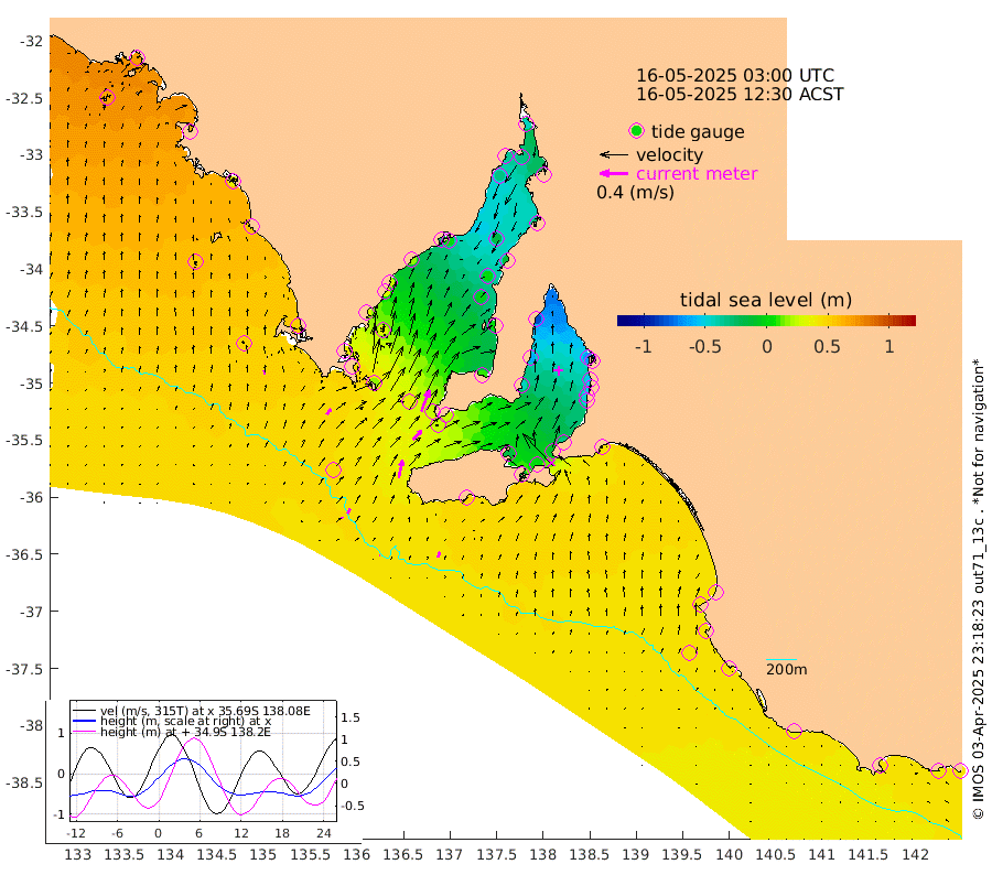 1cm/s 47T +10cm/s rms + 5cm/s 114T. SAM1DS 520m 10cm/s 37T +13cm/s rms + 5cm/s -36T. SAM2CP 100m 8cm/s 21T +21cm/s rms + 18cm/s 142T. SAM3MS 168m 8cm/s 24T +22cm/s rms + 0cm/s -30T. SAM4CY 117m 6cm/s -8T +23cm/s rms + 2cm/s 99T. SAM5CB 94m 18cm/s 42T +8cm/s rms + 3cm/s -172T. SAM6IS 83m 4cm/s 12T +11cm/s rms + 7cm/s 150T. SAM7DS 519m 32cm/s 21T +10cm/s rms + 2cm/s 87T. SAM8SG 47m 25cm/s 12T +20cm/s rms + 12cm/s -168T. NRSKAI 101m 45cm Warrnambool 41cm Port Fairy 43cm Portland 37cm Port Macdonnell 43cm Beachport 45cm Cape Rabelais (off) 43cm Robe 42cm Cape Jaffa 42cm Kingston 44cm Victor Harbor 49cm Vivonne Bay -15cm Kingscote -15cm American River 2cm Penneshaw -10cm Cape Jervis -31cm Second Valley -48cm Port Noarlunga -51cm Port Stanvac -54cm Brighton -56cm Glenelg -66cm Port Adelaide (Outer Harbor) -74cm Angus Inlet (Garden Island) -83cm Ardrossan -63cm Port Vincent -42cm Port Giles 25cm Stenhouse Bay 26cm Althorpe Island 24cm Pondalowie Bay 9cm Point Turton 4cm Port Victoria -2cm Cape Elizabeth 1cm Tiparra Reef Light -13cm Wallaroo -16cm Middle Bank -26cm Port Broughton -33cm Port Pirie -42cm Red Cliff Point (Beacon 5) -33cm Port Bonython -36cm Whyalla -32cm Western Shoal Beacon -28cm Franklin Harbor 2cm Franklin Harbor Entrance Beacon 15cm Arno Bay 23cm Port Neill 27cm Cape Hardy 33cm Tumby Bay 32cm Reevesby Island 41cm Port Lincoln 45cm Taylors Landing 17cm Whalers Bay 34cm Wedge Island Mooring 45cm Shelf Edge Mooring 52cm Coffin Bay Entrance Beacon 49cm Greenly Island 54cm Elliston 54cm Pearson Island 36cm Venus Bay 67cm Blanche Port (Streaky Bay) 69cm Thevenard 66cm St Francis Island