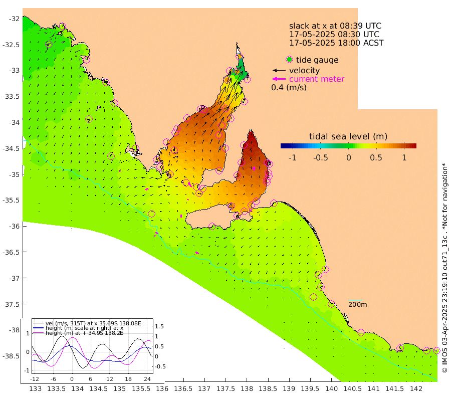 1cm/s -68T +10cm/s rms + 5cm/s 114T. SAM1DS 520m 9cm/s -110T +13cm/s rms + 5cm/s -36T. SAM2CP 100m 8cm/s -62T +21cm/s rms + 18cm/s 142T. SAM3MS 168m 11cm/s -70T +22cm/s rms + 0cm/s -30T. SAM4CY 117m 5cm/s -142T +23cm/s rms + 2cm/s 99T. SAM5CB 94m 3cm/s 19T +8cm/s rms + 3cm/s -172T. SAM6IS 83m 3cm/s -54T +11cm/s rms + 7cm/s 150T. SAM7DS 519m 17cm/s -34T +10cm/s rms + 2cm/s 87T. SAM8SG 47m 8cm/s -3T +20cm/s rms + 12cm/s -168T. NRSKAI 101m 21cm Warrnambool 21cm Port Fairy 21cm Portland 26cm Port Macdonnell 20cm Beachport 23cm Cape Rabelais (off) 21cm Robe 26cm Cape Jaffa 25cm Kingston 29cm Victor Harbor 15cm Vivonne Bay 80cm Kingscote 72cm American River 68cm Penneshaw 67cm Cape Jervis 87cm Second Valley 103cm Port Noarlunga 106cm Port Stanvac 108cm Brighton 112cm Glenelg 118cm Port Adelaide (Outer Harbor) 109cm Angus Inlet (Garden Island) 139cm Ardrossan 127cm Port Vincent 108cm Port Giles 44cm Stenhouse Bay 49cm Althorpe Island 38cm Pondalowie Bay 67cm Point Turton 66cm Port Victoria 73cm Cape Elizabeth 76cm Tiparra Reef Light 78cm Wallaroo 85cm Middle Bank 30cm Port Broughton 58cm Port Pirie 63cm Red Cliff Point (Beacon 5) 72cm Port Bonython 78cm Whyalla 78cm Western Shoal Beacon 84cm Franklin Harbor 91cm Franklin Harbor Entrance Beacon 81cm Arno Bay 87cm Port Neill 74cm Cape Hardy 68cm Tumby Bay 60cm Reevesby Island 53cm Port Lincoln 38cm Taylors Landing 58cm Whalers Bay 42cm Wedge Island Mooring 23cm Shelf Edge Mooring 25cm Coffin Bay Entrance Beacon 17cm Greenly Island 22cm Elliston 19cm Pearson Island 25cm Venus Bay 24cm Blanche Port (Streaky Bay) 19cm Thevenard 17cm St Francis Island