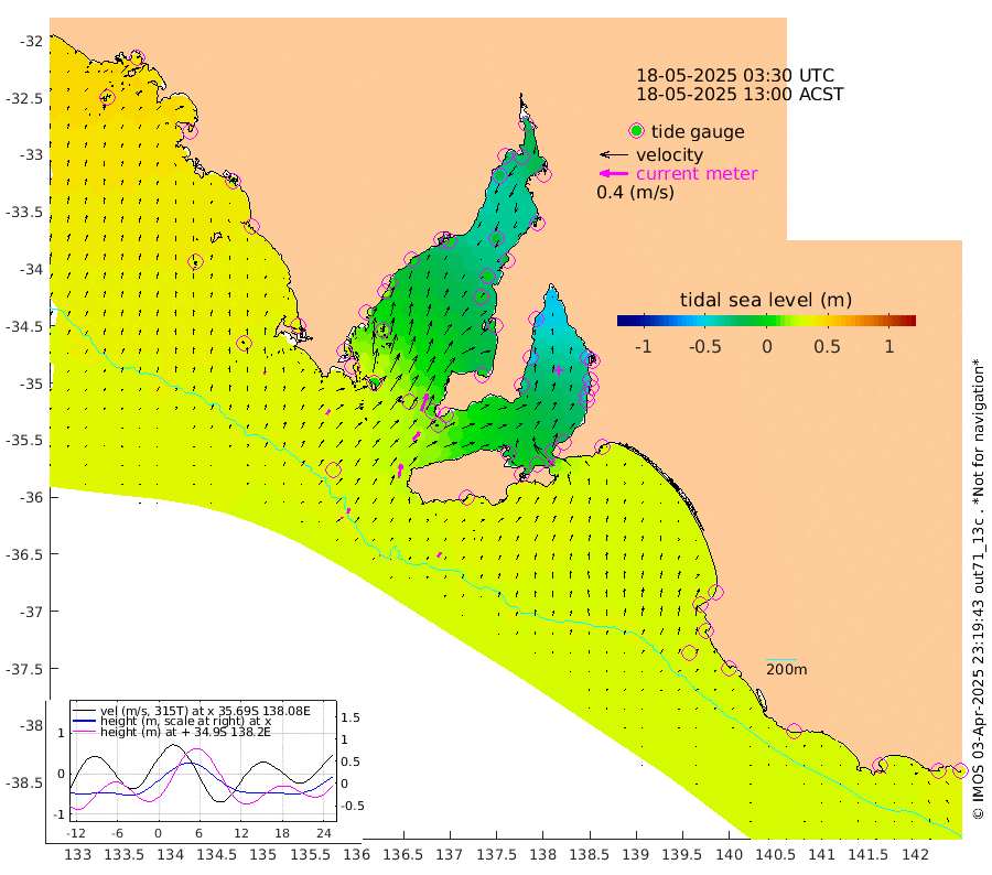 1cm/s 58T +10cm/s rms + 5cm/s 114T. SAM1DS 520m 8cm/s 36T +13cm/s rms + 5cm/s -36T. SAM2CP 100m 7cm/s 14T +21cm/s rms + 18cm/s 142T. SAM3MS 168m 8cm/s 34T +22cm/s rms + 0cm/s -30T. SAM4CY 117m 4cm/s -2T +23cm/s rms + 2cm/s 99T. SAM5CB 94m 14cm/s 40T +8cm/s rms + 3cm/s -172T. SAM6IS 83m 3cm/s 4T +11cm/s rms + 7cm/s 150T. SAM7DS 519m 26cm/s 19T +10cm/s rms + 2cm/s 87T. SAM8SG 47m 19cm/s 11T +20cm/s rms + 12cm/s -168T. NRSKAI 101m 31cm Warrnambool 28cm Port Fairy 29cm Portland 23cm Port Macdonnell 28cm Beachport 29cm Cape Rabelais (off) 28cm Robe 27cm Cape Jaffa 26cm Kingston 28cm Victor Harbor 33cm Vivonne Bay -14cm Kingscote -15cm American River -2cm Penneshaw -10cm Cape Jervis -24cm Second Valley -37cm Port Noarlunga -39cm Port Stanvac -42cm Brighton -45cm Glenelg -50cm Port Adelaide (Outer Harbor) -56cm Angus Inlet (Garden Island) -63cm Ardrossan -56cm Port Vincent -35cm Port Giles 12cm Stenhouse Bay 13cm Althorpe Island 11cm Pondalowie Bay 1cm Point Turton -3cm Port Victoria -6cm Cape Elizabeth -4cm Tiparra Reef Light -12cm Wallaroo -13cm Middle Bank -30cm Port Broughton -23cm Port Pirie -25cm Red Cliff Point (Beacon 5) -27cm Port Bonython -24cm Whyalla -20cm Western Shoal Beacon -21cm Franklin Harbor 0cm Franklin Harbor Entrance Beacon 7cm Arno Bay 9cm Port Neill 16cm Cape Hardy 20cm Tumby Bay 18cm Reevesby Island 24cm Port Lincoln 28cm Taylors Landing 7cm Whalers Bay 19cm Wedge Island Mooring 29cm Shelf Edge Mooring 31cm Coffin Bay Entrance Beacon 32cm Greenly Island 34cm Elliston 30cm Pearson Island 20cm Venus Bay 38cm Blanche Port (Streaky Bay) 41cm Thevenard 39cm St Francis Island