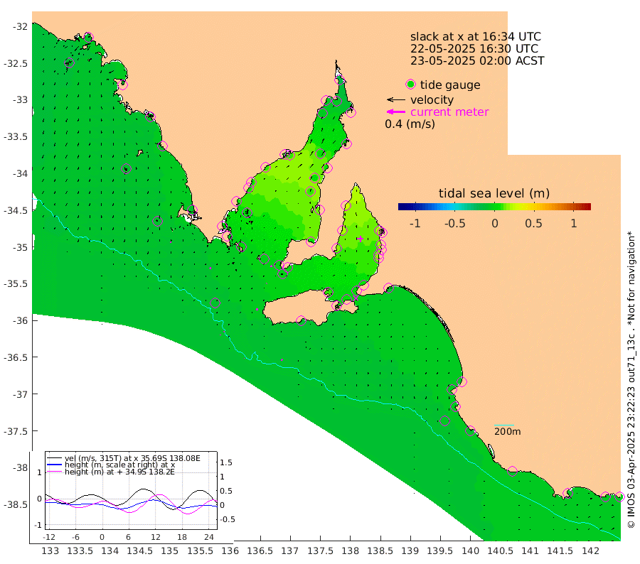 0cm/s -37T +10cm/s rms + 5cm/s 114T. SAM1DS 520m 3cm/s -155T +13cm/s rms + 5cm/s -36T. SAM2CP 100m 2cm/s -155T +21cm/s rms + 18cm/s 142T. SAM3MS 168m 3cm/s -145T +22cm/s rms + 0cm/s -30T. SAM4CY 117m 3cm/s -179T +23cm/s rms + 2cm/s 99T. SAM5CB 94m 1cm/s 75T +8cm/s rms + 3cm/s -172T. SAM6IS 83m 1cm/s 175T +11cm/s rms + 7cm/s 150T. SAM7DS 519m 4cm/s -153T +10cm/s rms + 2cm/s 87T. SAM8SG 47m 4cm/s -172T +20cm/s rms + 12cm/s -168T. NRSKAI 101m -7cm Warrnambool -7cm Port Fairy -7cm Portland -9cm Port Macdonnell -8cm Beachport -7cm Cape Rabelais (off) -6cm Robe -7cm Cape Jaffa -9cm Kingston -8cm Victor Harbor -11cm Vivonne Bay 10cm Kingscote 6cm American River 5cm Penneshaw 7cm Cape Jervis 7cm Second Valley 16cm Port Noarlunga 18cm Port Stanvac 18cm Brighton 20cm Glenelg 22cm Port Adelaide (Outer Harbor) 20cm Angus Inlet (Garden Island) 28cm Ardrossan 21cm Port Vincent 18cm Port Giles 0cm Stenhouse Bay -3cm Althorpe Island -1cm Pondalowie Bay 7cm Point Turton 12cm Port Victoria 9cm Cape Elizabeth 6cm Tiparra Reef Light 5cm Wallaroo 6cm Middle Bank -1cm Port Broughton -11cm Port Pirie -17cm Red Cliff Point (Beacon 5) -5cm Port Bonython -5cm Whyalla -6cm Western Shoal Beacon 7cm Franklin Harbor 8cm Franklin Harbor Entrance Beacon 8cm Arno Bay 7cm Port Neill 6cm Cape Hardy 4cm Tumby Bay 2cm Reevesby Island 1cm Port Lincoln -4cm Taylors Landing 5cm Whalers Bay -2cm Wedge Island Mooring -9cm Shelf Edge Mooring -9cm Coffin Bay Entrance Beacon -8cm Greenly Island -9cm Elliston -8cm Pearson Island -5cm Venus Bay -9cm Blanche Port (Streaky Bay) -9cm Thevenard -9cm St Francis Island
