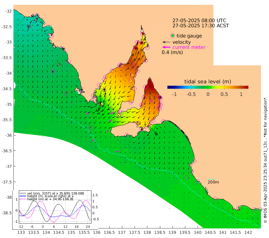 1cm/s -123T +10cm/s rms + 5cm/s 114T. SAM1DS 520m 14cm/s -122T +13cm/s rms + 5cm/s -36T. SAM2CP 100m 10cm/s -106T +21cm/s rms + 18cm/s 142T. SAM3MS 168m 12cm/s -87T +22cm/s rms + 0cm/s -30T. SAM4CY 117m 6cm/s -165T +23cm/s rms + 2cm/s 99T. SAM5CB 94m 16cm/s -125T +8cm/s rms + 3cm/s -172T. SAM6IS 83m 3cm/s -113T +11cm/s rms + 7cm/s 150T. SAM7DS 519m 21cm/s -115T +10cm/s rms + 2cm/s 87T. SAM8SG 47m 13cm/s -158T +20cm/s rms + 12cm/s -168T. NRSKAI 101m 5cm Warrnambool 4cm Port Fairy 2cm Portland 6cm Port Macdonnell -3cm Beachport -2cm Cape Rabelais (off) -2cm Robe 2cm Cape Jaffa 1cm Kingston 2cm Victor Harbor -12cm Vivonne Bay 63cm Kingscote 59cm American River 44cm Penneshaw 55cm Cape Jervis 80cm Second Valley 95cm Port Noarlunga 99cm Port Stanvac 101cm Brighton 104cm Glenelg 114cm Port Adelaide (Outer Harbor) 127cm Angus Inlet (Garden Island) 133cm Ardrossan 100cm Port Vincent 89cm Port Giles 15cm Stenhouse Bay 23cm Althorpe Island 13cm Pondalowie Bay 45cm Point Turton 45cm Port Victoria 53cm Cape Elizabeth 67cm Tiparra Reef Light 87cm Wallaroo 95cm Middle Bank 63cm Port Broughton 126cm Port Pirie 139cm Red Cliff Point (Beacon 5) 125cm Port Bonython 133cm Whyalla 128cm Western Shoal Beacon 89cm Franklin Harbor 69cm Franklin Harbor Entrance Beacon 48cm Arno Bay 45cm Port Neill 35cm Cape Hardy 26cm Tumby Bay 24cm Reevesby Island 11cm Port Lincoln -2cm Taylors Landing 32cm Whalers Bay 11cm Wedge Island Mooring -5cm Shelf Edge Mooring -9cm Coffin Bay Entrance Beacon -13cm Greenly Island -14cm Elliston -20cm Pearson Island -1cm Venus Bay -25cm Blanche Port (Streaky Bay) -29cm Thevenard -23cm St Francis Island