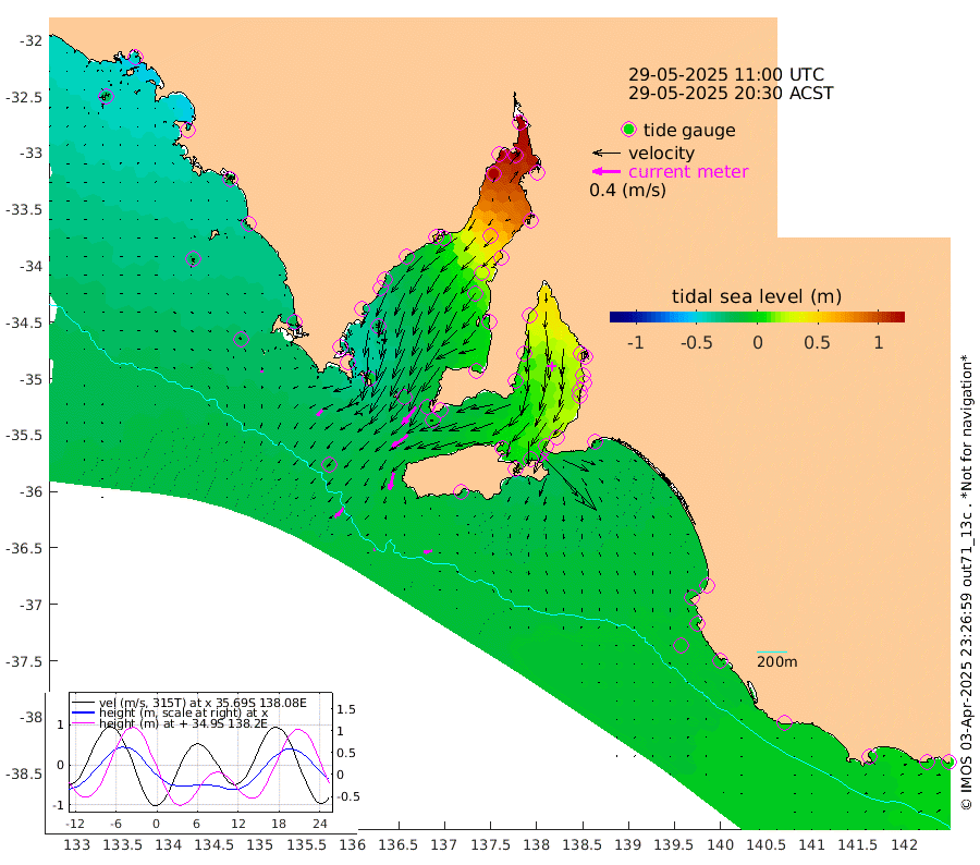 1cm/s -112T +10cm/s rms + 5cm/s 114T. SAM1DS 520m 11cm/s -135T +13cm/s rms + 5cm/s -36T. SAM2CP 100m 13cm/s -142T +21cm/s rms + 18cm/s 142T. SAM3MS 168m 12cm/s -97T +22cm/s rms + 0cm/s -30T. SAM4CY 117m 3cm/s 158T +23cm/s rms + 2cm/s 99T. SAM5CB 94m 28cm/s -128T +8cm/s rms + 3cm/s -172T. SAM6IS 83m 6cm/s -146T +11cm/s rms + 7cm/s 150T. SAM7DS 519m 32cm/s -142T +10cm/s rms + 2cm/s 87T. SAM8SG 47m 25cm/s -165T +20cm/s rms + 12cm/s -168T. NRSKAI 101m 2cm Warrnambool 1cm Port Fairy -1cm Portland 0cm Port Macdonnell -6cm Beachport -6cm Cape Rabelais (off) -6cm Robe -4cm Cape Jaffa -6cm Kingston -10cm Victor Harbor -16cm Vivonne Bay 6cm Kingscote 15cm American River -3cm Penneshaw 10cm Cape Jervis 23cm Second Valley 20cm Port Noarlunga 21cm Port Stanvac 23cm Brighton 21cm Glenelg 27cm Port Adelaide (Outer Harbor) 61cm Angus Inlet (Garden Island) 24cm Ardrossan 1cm Port Vincent 4cm Port Giles -15cm Stenhouse Bay -5cm Althorpe Island -8cm Pondalowie Bay 1cm Point Turton 3cm Port Victoria 9cm Cape Elizabeth 24cm Tiparra Reef Light 57cm Wallaroo 60cm Middle Bank 90cm Port Broughton 160cm Port Pirie 174cm Red Cliff Point (Beacon 5) 140cm Port Bonython 139cm Whyalla 124cm Western Shoal Beacon 44cm Franklin Harbor 4cm Franklin Harbor Entrance Beacon -12cm Arno Bay -22cm Port Neill -22cm Cape Hardy -27cm Tumby Bay -23cm Reevesby Island -32cm Port Lincoln -29cm Taylors Landing -7cm Whalers Bay -16cm Wedge Island Mooring -12cm Shelf Edge Mooring -22cm Coffin Bay Entrance Beacon -19cm Greenly Island -24cm Elliston -24cm Pearson Island -15cm Venus Bay -40cm Blanche Port (Streaky Bay) -42cm Thevenard -26cm St Francis Island